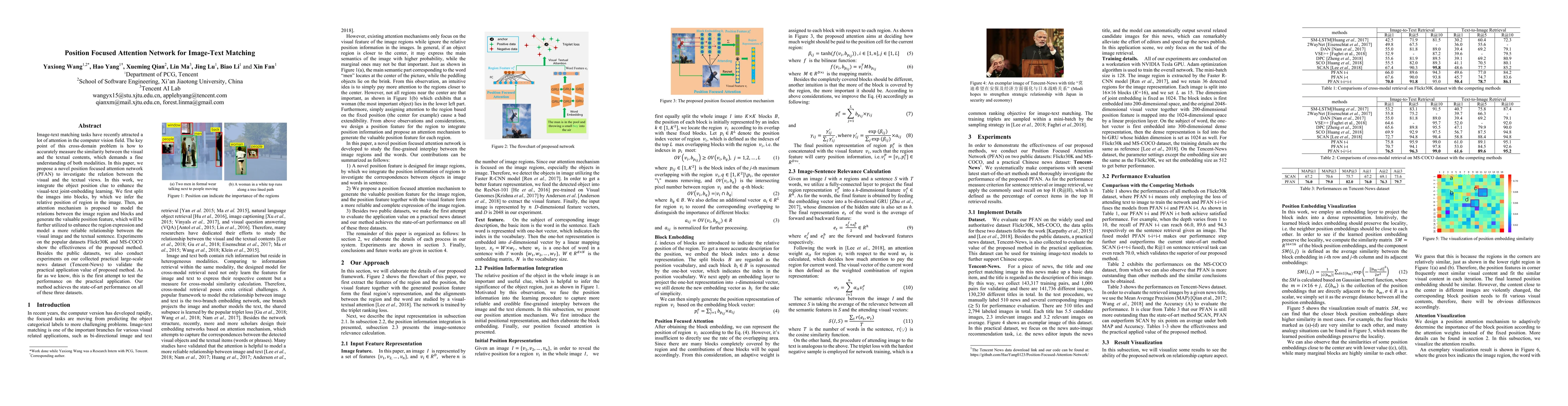 Image-text matching tasks have recently attracted a lot of attention in the computer vision field. The key point of this cross-domain problem is how to accurately measure the similarity between the visual and the textual contents, which demands a fine understanding of both modalities. In this paper, we propose a novel position focused attention network (PFAN) to investigate the relation between the visual and the textual views. In this work, we integrate the object position clue to enhance the visual-text joint-embedding learning. We first split the images into blocks, by which we infer the relative position of region in the image. Then, an attention mechanism is proposed to model the relations between the image region and blocks and generate the valuable position feature, which will be further utilized to enhance the region expression and model a more reliable relationship between the visual image and the textual sentence. Experiments on the popular datasets Flickr30K and MS-COCO show the effectiveness of the proposed method. Besides the public datasets, we also conduct experiments on our collected practical large-scale news dataset (Tencent-News) to validate the practical application value of proposed method. As far as we know, this is the first attempt to test the performance on the practical application. Our method achieves the state-of-art performance on all of these three datasets.