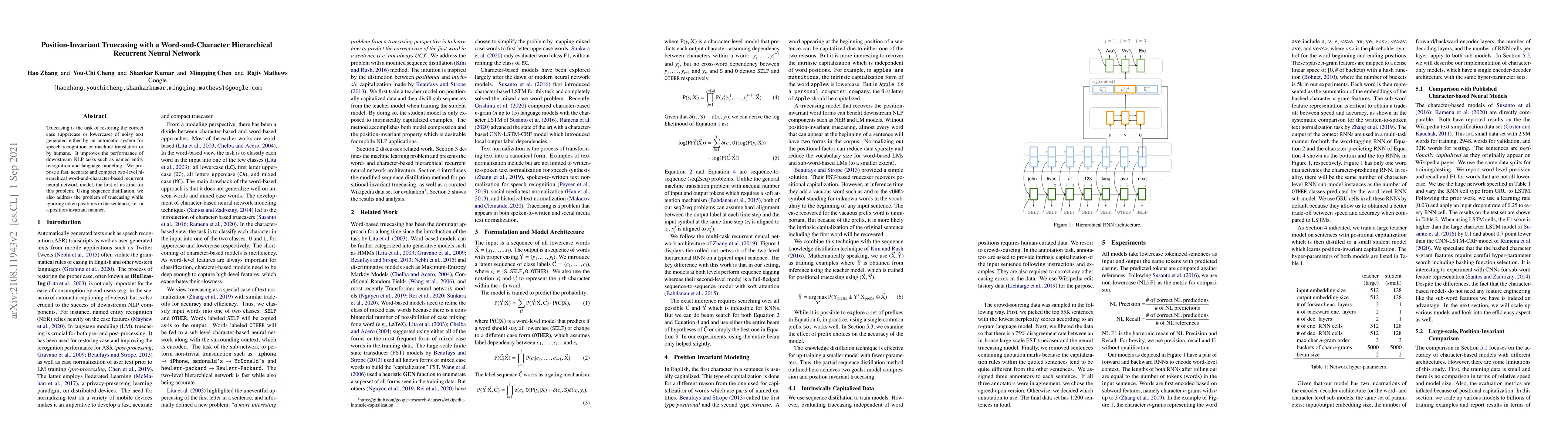 This paper proposes a novel hierarchical recurrent neural network for truecasing, which restores correct text case from noisy input. The model uses a two-level structure focusing on words and characters, achieving high accuracy and position-invariance through sequence distillation.