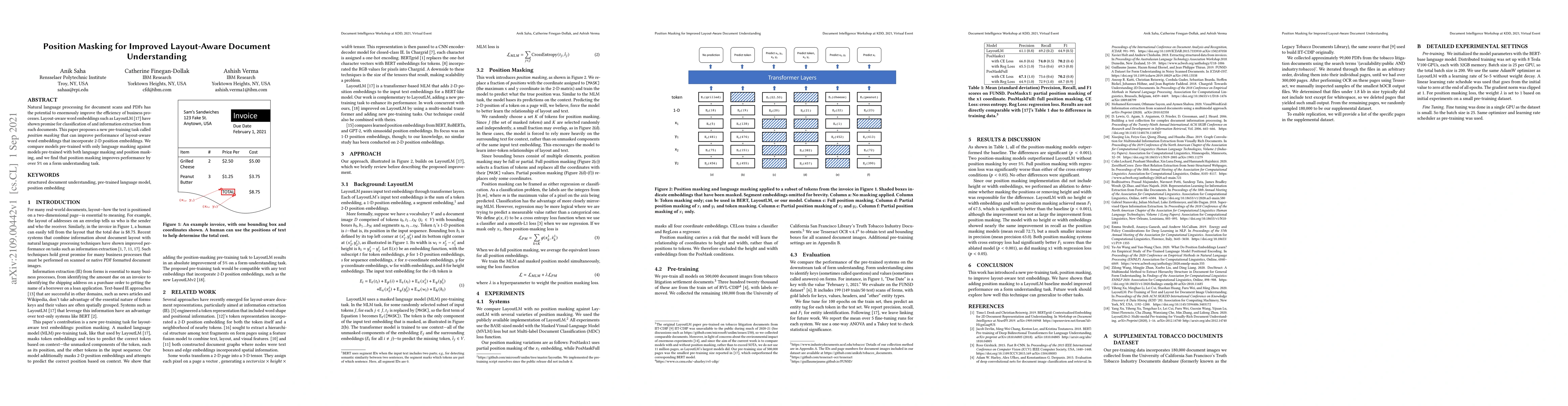 Natural language processing for document scans and PDFs has the potential to enormously improve the efficiency of business processes. Layout-aware word embeddings such as LayoutLM have shown promise for classification of and information extraction from such documents. This paper proposes a new pre-training task called that can improve performance of layout-aware word embeddings that incorporate 2-D position embeddings. We compare models pre-trained with only language masking against models pre-trained with both language masking and position masking, and we find that position masking improves performance by over 5% on a form understanding task.
