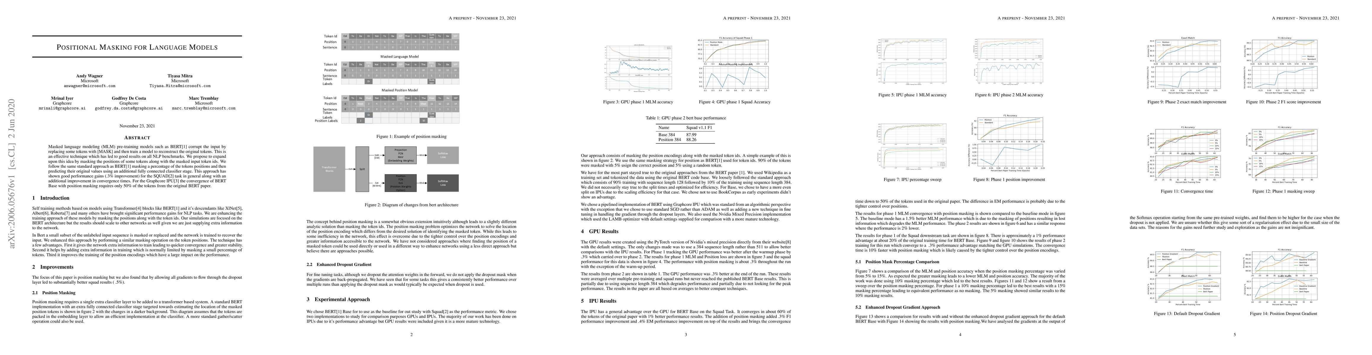 Title: Position Masking for Language Models Summary: This paper proposes an enhanced masked language modeling technique by masking token positions in addition to tokens, achieving a .3% performance improvement and faster convergence, especially on Graphcore IPU hardware.