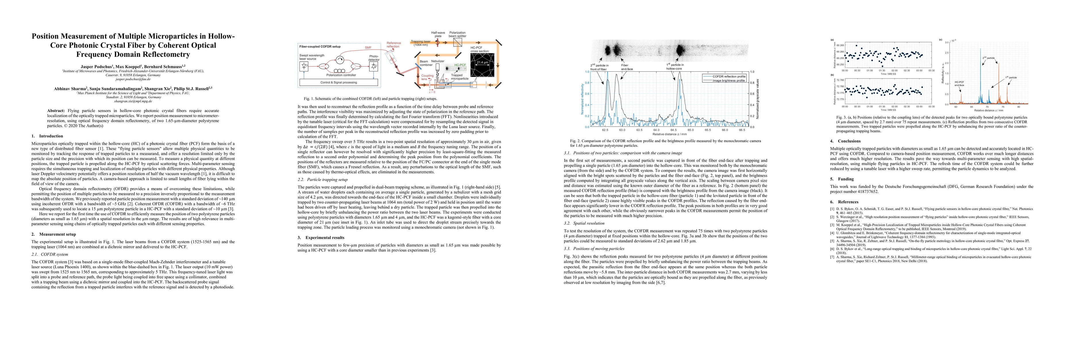 This paper presents a method for accurately measuring the positions of multiple microparticles trapped in hollow-core photonic crystal fibers using coherent optical frequency domain reflectometry, achieving micrometer-resolution. The technique was demonstrated by localizing two 1.65-µm-diameter polystyrene particles.