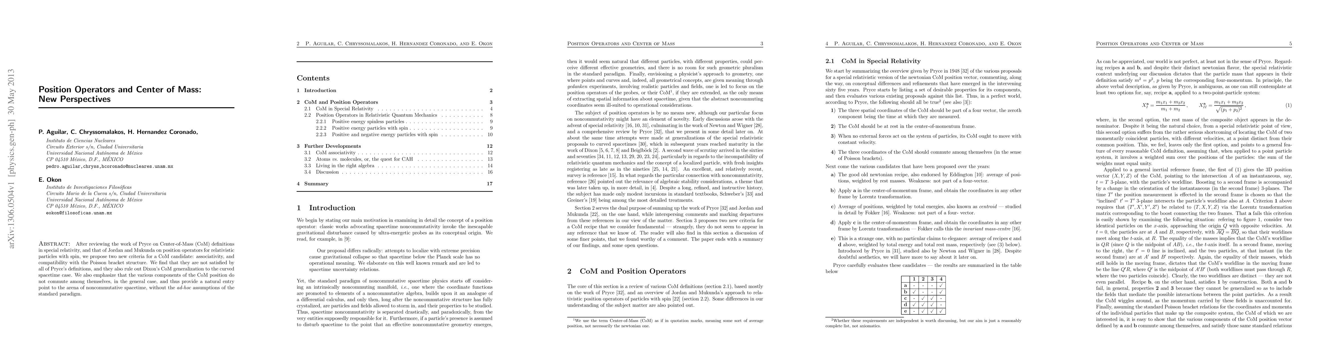 After reviewing the work of Pryce on Center-of-Mass (CoM) definitions in special relativity, and that of Jordan and Mukunda on position operators for relativistic particles with spin, we propose two new criteria for a CoM candidate: associativity, and compatibility with the Poisson bracket structure. We find that they are not satisfied by all of Pryce's definitions, and they also rule out Dixon's CoM generalization to the curved spacetime case. We also emphasize that the various components of the CoM position do not commute among themselves, in the general case, and thus provide a natural entry point to the arena of noncommutative spacetime, without the ad-hoc assumptions of the standard paradigm.