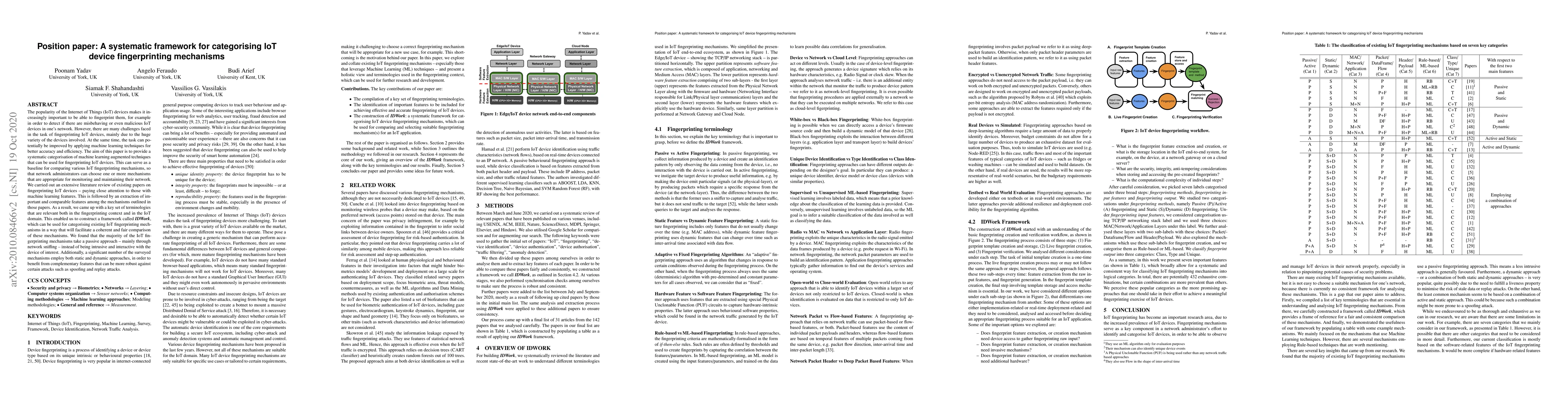 This paper presents a systematic framework, IDWork, for categorising IoT device fingerprinting mechanisms, particularly those augmented with machine learning. The study highlights that most mechanisms use passive, network-sniffing approaches, often combining static and dynamic methods to enhance robustness against attacks like spoofing.
