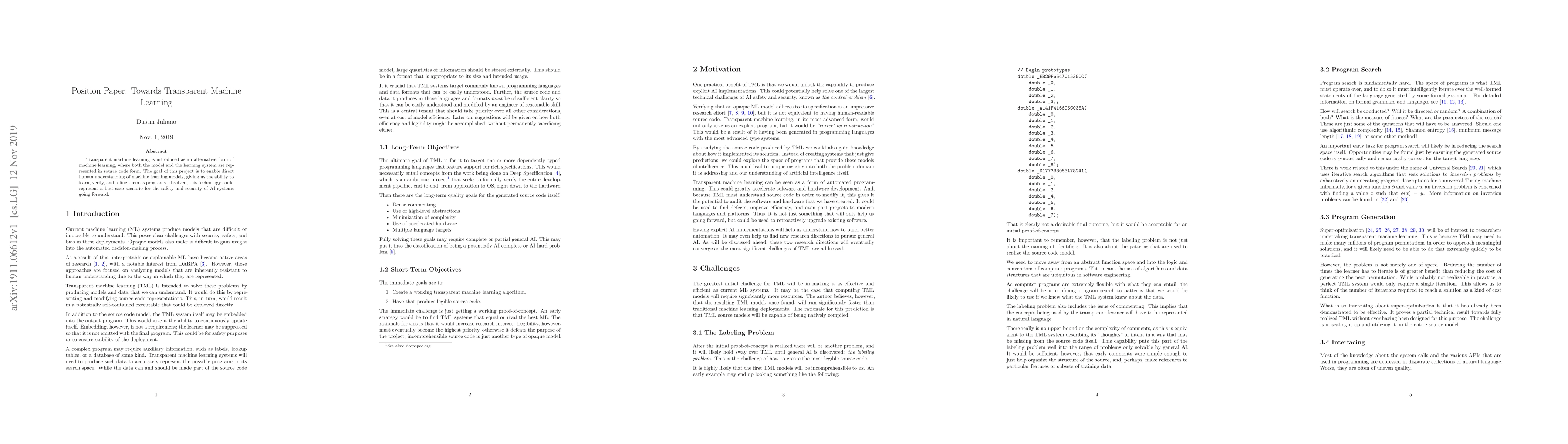 Transparent machine learning is introduced as an alternative form of machine learning, where both the model and the learning system are represented in source code form. The goal of this project is to enable direct human understanding of machine learning models, giving us the ability to learn, verify, and refine them as programs. If solved, this technology could represent a best-case scenario for the safety and security of AI systems going forward.