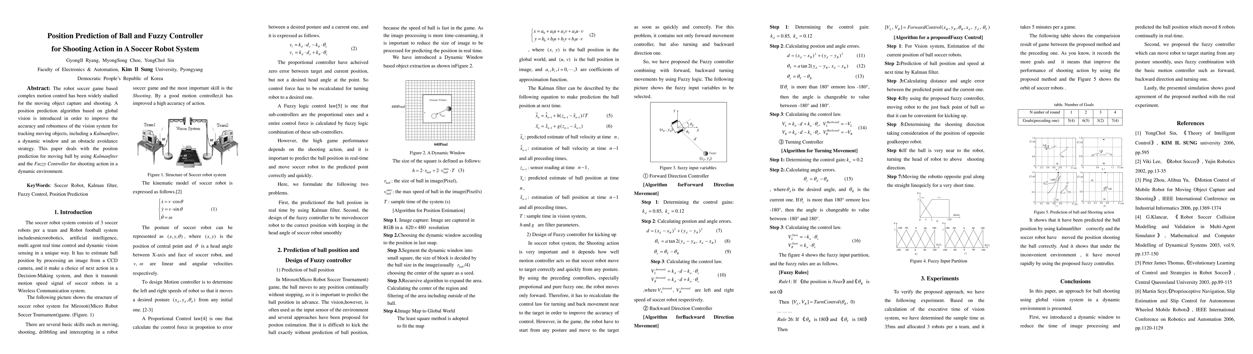 The robot soccer game based complex motion control has been widely studied for the moving object capture and shooting. A position prediction algorithm based on global vision is introduced in order to improve the accuracy and robustness of the vision system for tracking moving objects, including a Kalmanfiter, a dynamic window and an obstacle avoidance strategy. This paper deals with the positon prediction for moving ball by using Kalmanfiter and the Fuzzy Controller for shooting action in a dynamic environment.