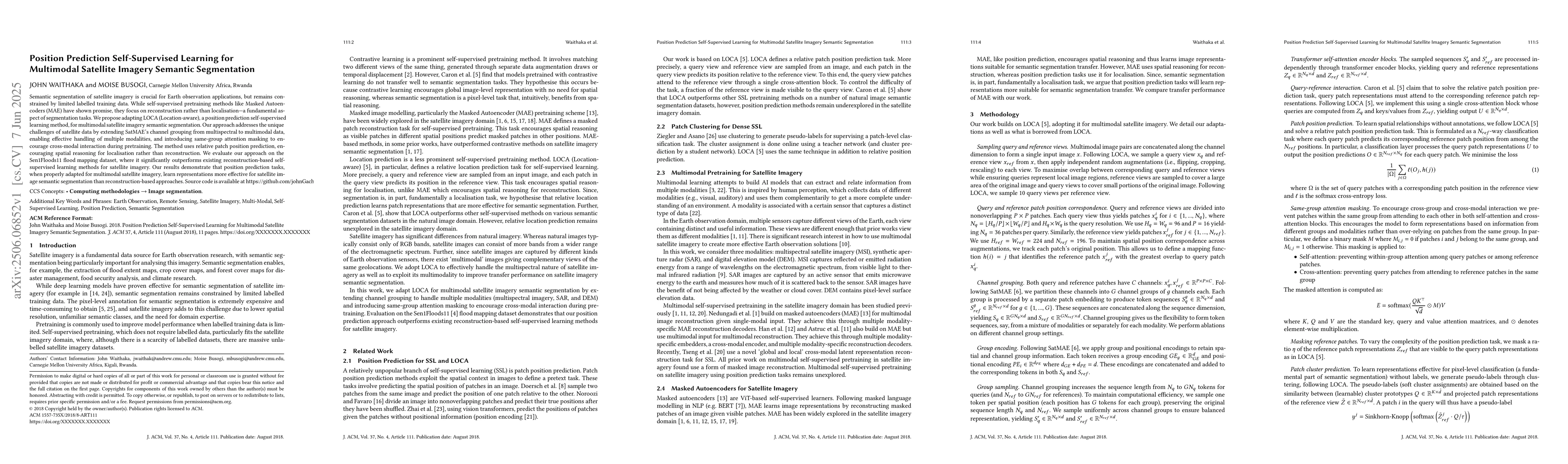 This work is novel in adapting LOCA for multimodal satellite imagery semantic segmentation, focusing on localisation through position prediction rather than reconstruction, and demonstrating improved performance on a satellite imagery segmentation task.