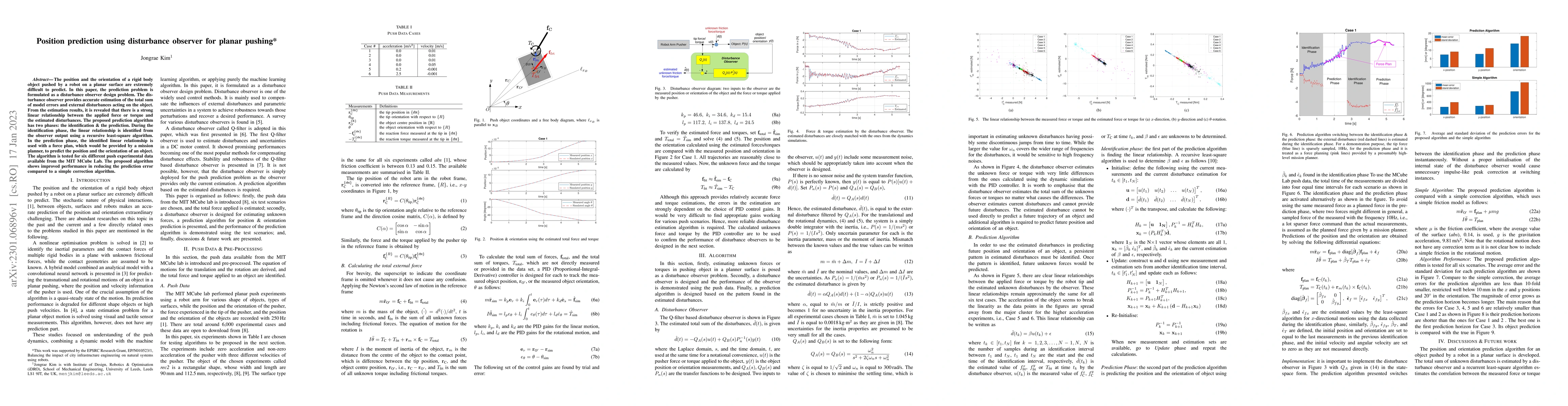 The position and the orientation of a rigid body object pushed by a robot on a planar surface are extremely difficult to predict. In this paper, the prediction problem is formulated as a disturbance observer design problem. The disturbance observer provides accurate estimation of the total sum of model errors and external disturbances acting on the object. From the estimation results, it is revealed that there is a strong linear relationship between the applied force or torque and the estimated disturbances. The proposed prediction algorithm has two phases: the identification & the prediction. During the identification phase, the linear relationship is identified from the observer output using a recursive least-square algorithm. In the prediction phase, the identified linear relationship is used with a force plan, which would be provided by a mission planner, to predict the position and the orientation of an object. The algorithm is tested for six different push experimental data available from the MIT MCube Lab. The proposed algorithm shows improved performance in reducing the prediction error compared to a simple correction algorithm.