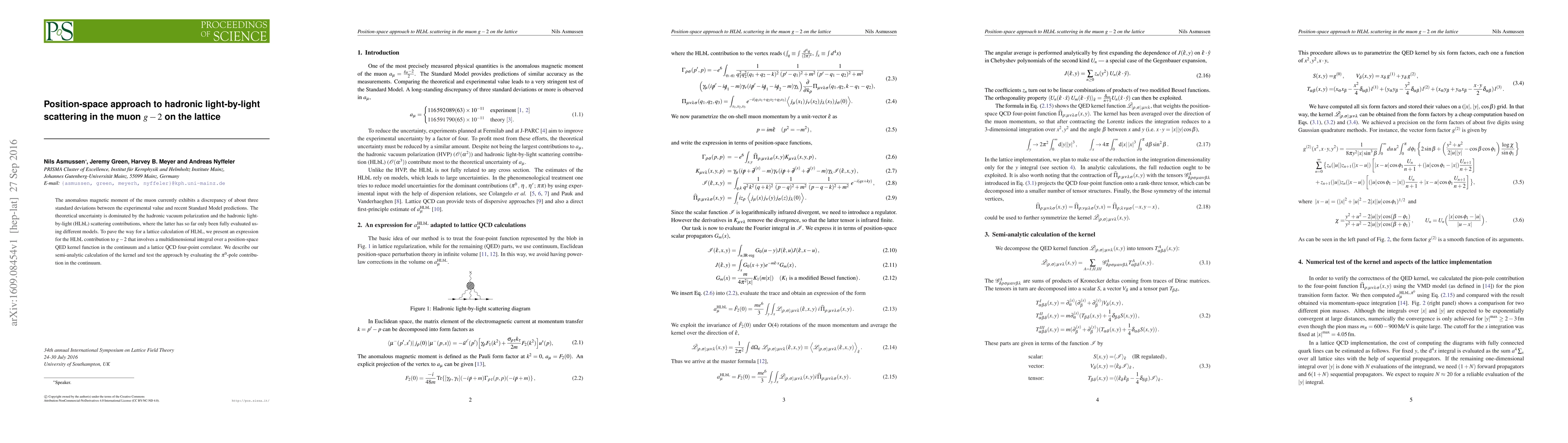 The anomalous magnetic moment of the muon currently exhibits a discrepancy of about three standard deviations between the experimental value and recent Standard Model predictions. The theoretical uncertainty is dominated by the hadronic vacuum polarization and the hadronic light-by-light (HLbL) scattering contributions, where the latter has so far only been fully evaluated using different models. To pave the way for a lattice calculation of HLbL, we present an expression for the HLbL contribution to $g-2$ that involves a multidimensional integral over a position-space QED kernel function in the continuum and a lattice QCD four-point correlator. We describe our semi-analytic calculation of the kernel and test the approach by evaluating the $\pi^0$-pole contribution in the continuum.