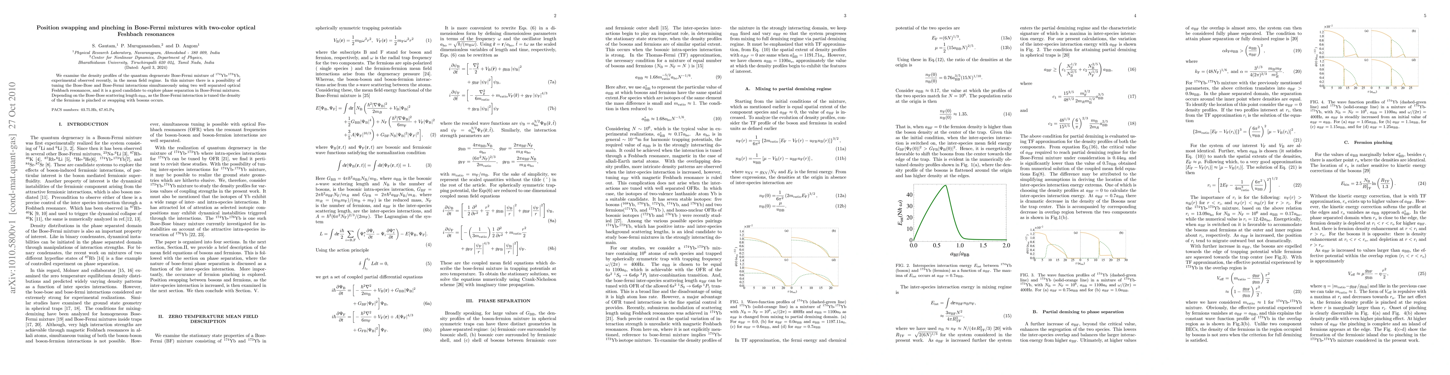 This paper investigates the density profiles of a quantum degenerate Bose-Fermi mixture of $^{174}$Yb-$^{173}$Yb under mean field conditions, focusing on phase separation dynamics. The study explores how tuning Bose-Bose and Bose-Fermi interactions via two-color optical Feshbach resonances can lead to either pinching or position swapping of fermion density relative to bosons.