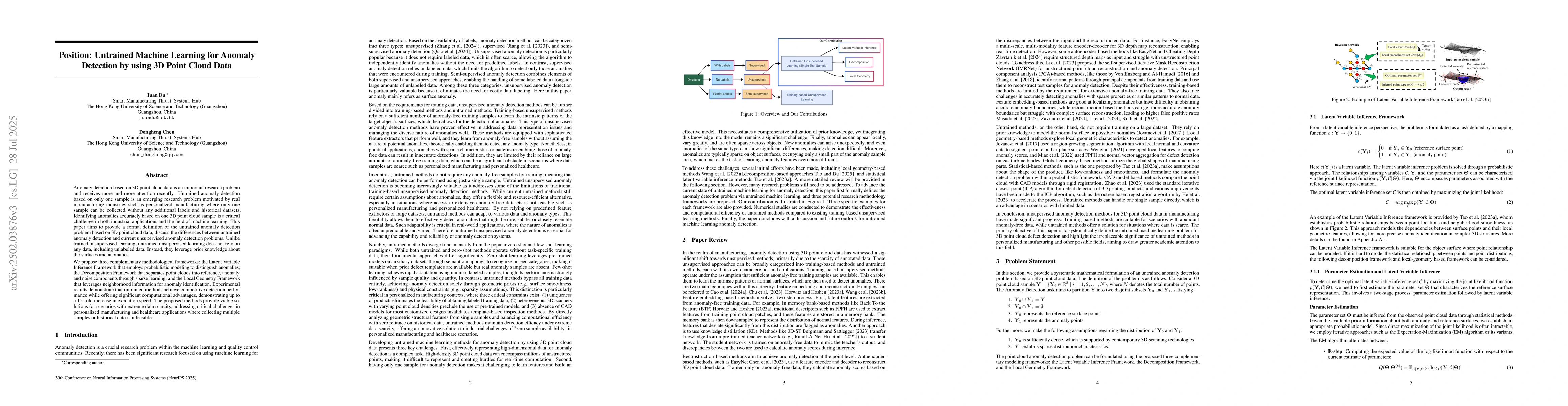Anomaly detection based on 3D point cloud data is an important research problem and receives more and more attention recently. Untrained anomaly detection based on only one sample is an emerging research problem motivated by real manufacturing industries such as personalized manufacturing where only one sample can be collected without any additional labels and historical datasets. Identifying anomalies accurately based on one 3D point cloud sample is a critical challenge in both industrial applications and the field of machine learning. This paper aims to provide a formal definition of the untrained anomaly detection problem based on 3D point cloud data, discuss the differences between untrained anomaly detection and current unsupervised anomaly detection problems. Unlike trained unsupervised learning, untrained unsupervised learning does not rely on any data, including unlabeled data. Instead, they leverage prior knowledge about the surfaces and anomalies. We propose three complementary methodological frameworks: the Latent Variable Inference Framework that employs probabilistic modeling to distinguish anomalies; the Decomposition Framework that separates point clouds into reference, anomaly, and noise components through sparse learning; and the Local Geometry Framework that leverages neighborhood information for anomaly identification. Experimental results demonstrate that untrained methods achieve competitive detection performance while offering significant computational advantages, demonstrating up to a 15-fold increase in execution speed. The proposed methods provide viable solutions for scenarios with extreme data scarcity, addressing critical challenges in personalized manufacturing and healthcare applications where collecting multiple samples or historical data is infeasible.