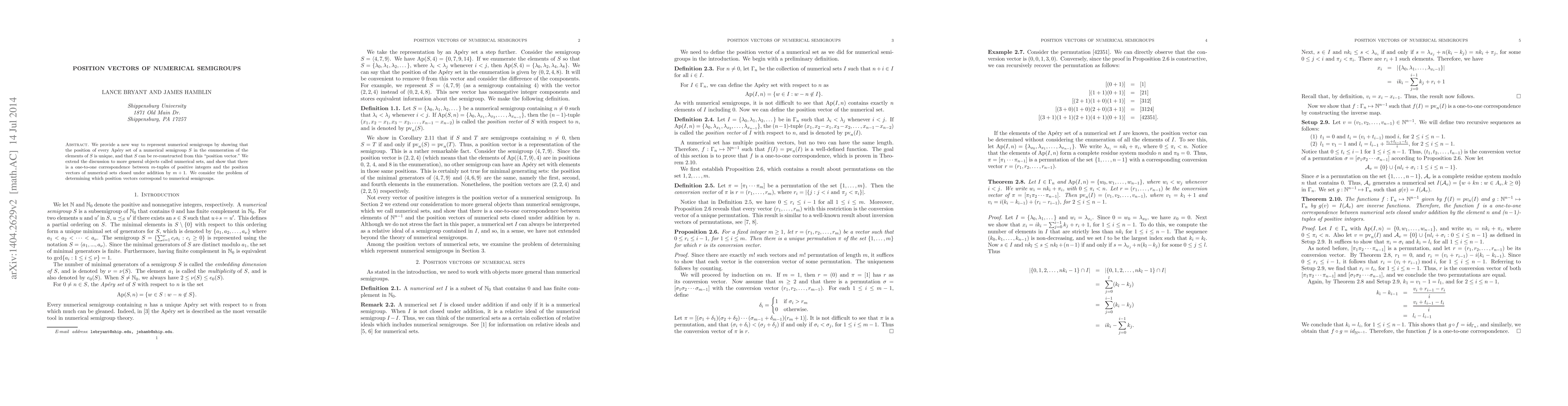 We provide a new way to represent numerical semigroups by showing that the position of every Ap\'ery set of a numerical semigroup $S$ in the enumeration of the elements of $S$ is unique, and that $S$ can be re-constructed from this "position vector." We extend the discussion to more general objects called numerical sets, and show that there is a one-to-one correspondence between $m$-tuples of positive integers and the position vectors of numerical sets closed under addition by $m+1$. We consider the problem of determining which position vectors correspond to numerical semigroups.