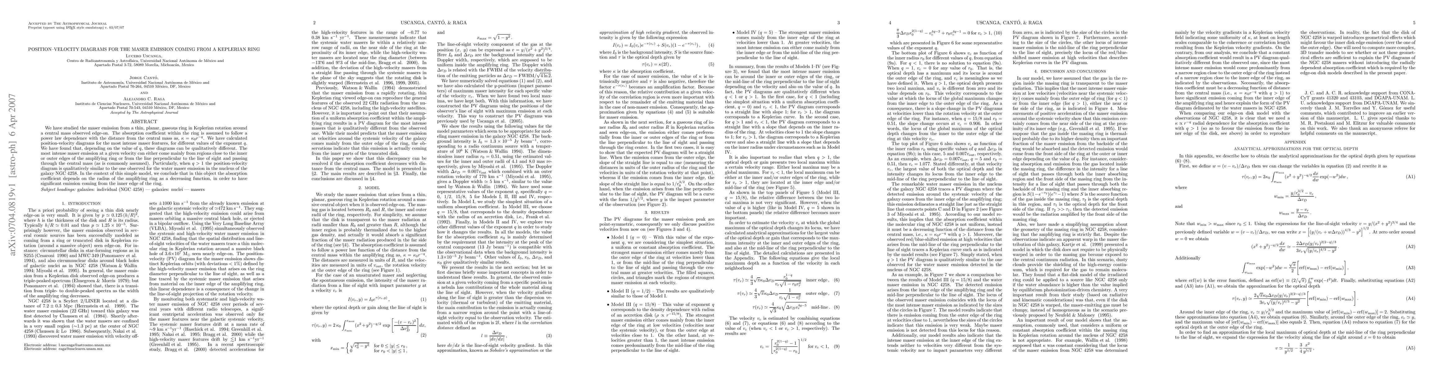 We have studied the maser emission from a thin, planar, gaseous ring in Keplerian rotation around a central mass observed edge-on. The absorption coefficient within the ring is assumed to follow a power law dependence with the distance from the central mass as, k=k0r^{-q}. We have calculated position-velocity diagrams for the most intense maser features, for different values of the exponent q. We have found that, depending on the value of q, these diagrams can be qualitatively different. The most intense maser emission at a given velocity can either come mainly from regions close to the inner or outer edges of the amplifying ring or from the line perpendicular to the line of sight and passing through the central mass (as is commonly assumed). Particularly, when q>1 the position-velocity diagram is qualitatively similar to the one observed for the water maser emission in the nucleus of the galaxy NGC 4258. In the context of this simple model, we conclude that in this object the absorption coefficient depends on the radius of the amplifying ring as a decreasing function, in order to have significant emission coming from the inner edge of the ring.