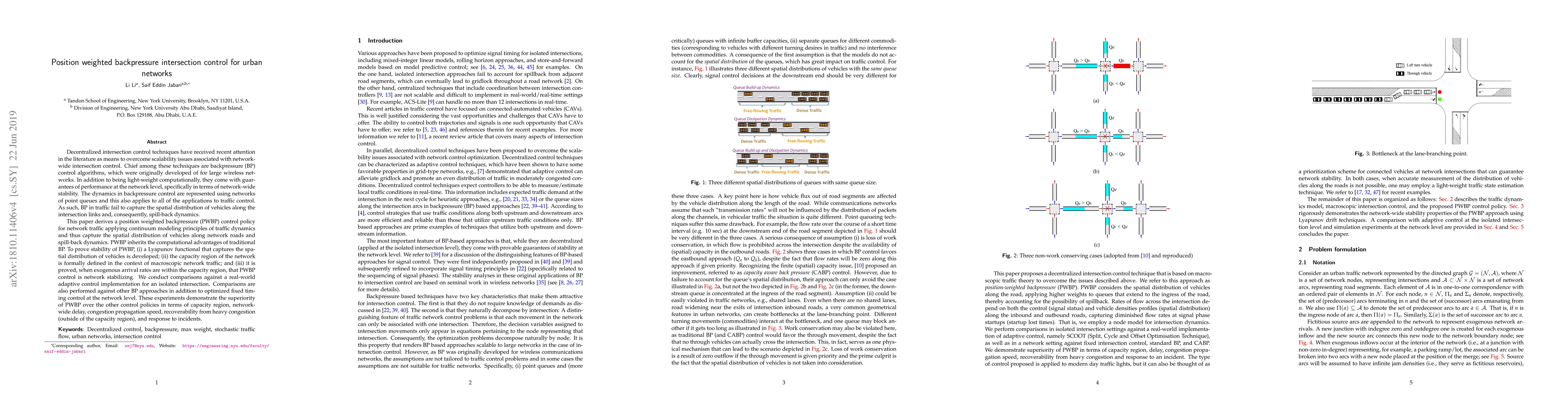 This paper proposes a position weighted backpressure (PWBP) control policy for urban traffic networks, enhancing traditional backpressure control by incorporating spatial distribution of vehicles and spill-back dynamics. PWBP is shown to be computationally efficient, stable, and superior in managing congestion, capacity, and incident response compared to other control methods through real-world and comparative experiments.