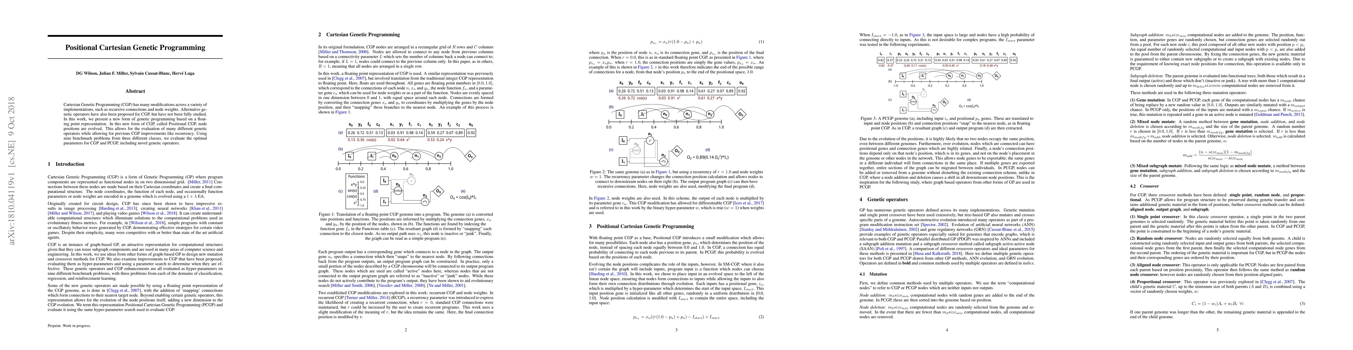 Cartesian Genetic Programming (CGP) has many modifications across a variety of implementations, such as recursive connections and node weights. Alternative genetic operators have also been proposed for CGP, but have not been fully studied. In this work, we present a new form of genetic programming based on a floating point representation. In this new form of CGP, called Positional CGP, node positions are evolved. This allows for the evaluation of many different genetic operators while allowing for previous CGP improvements like recurrency. Using nine benchmark problems from three different classes, we evaluate the optimal parameters for CGP and PCGP, including novel genetic operators.