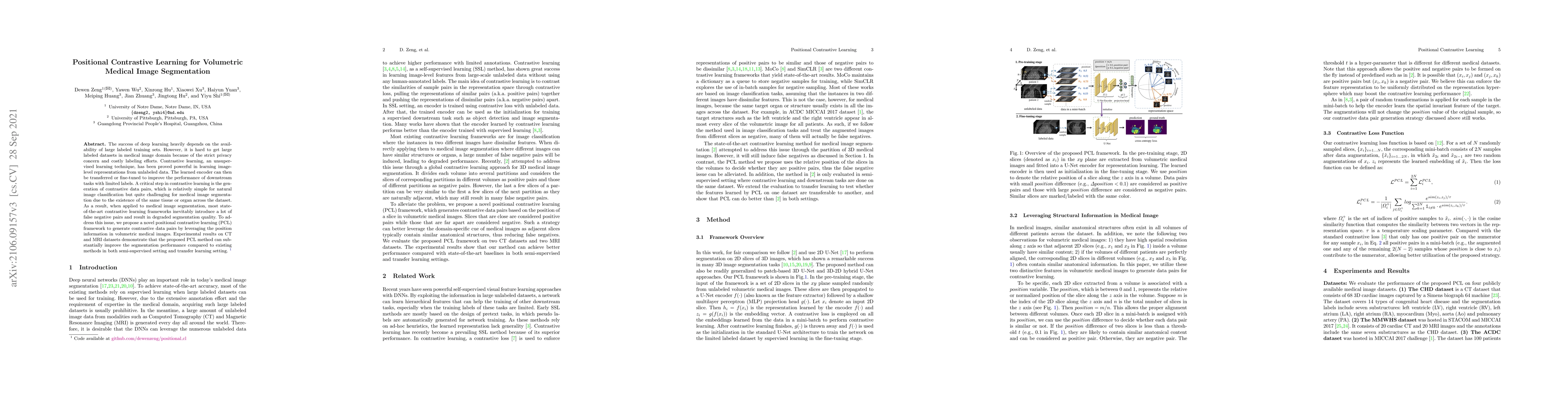 The paper proposes a novel positional contrastive learning (PCL) framework to generate effective contrastive data pairs for volumetric medical image segmentation, leveraging position information to reduce false-negative pairs. Experimental results show that the PCL method significantly enhances segmentation performance over existing methods in both semi-supervised and transfer learning settings.