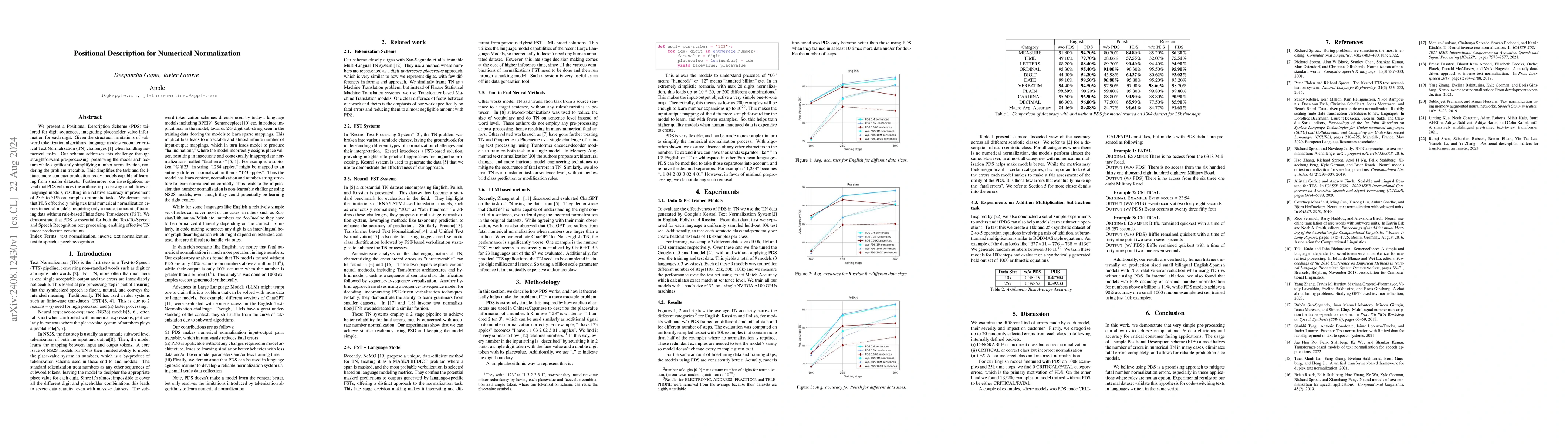 The paper introduces a Positional Description Scheme (PDS) for digit sequences to tackle Text Normalization (TN) challenges in language models, enhancing arithmetic processing by 23% to 51%. PDS simplifies number normalization, enabling effective TN and improving model accuracy with minimal training data.