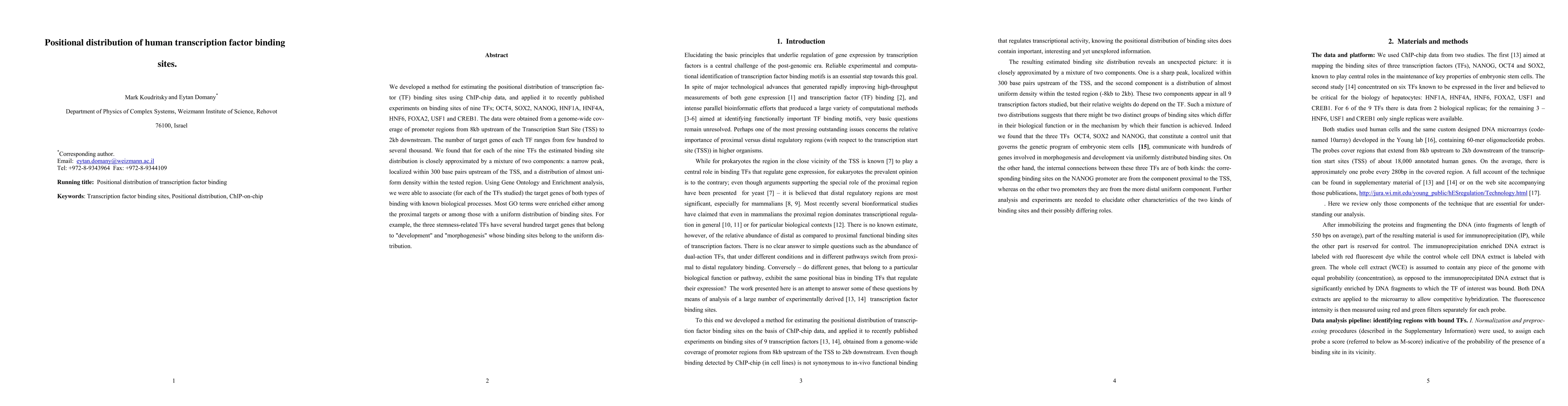 We developed a method for estimating the positional distribution of transcription fac-tor (TF) binding sites using ChIP-chip data, and applied it to recently published experiments on binding sites of nine TFs; OCT4, SOX2, NANOG, HNF1A, HNF4A, HNF6, FOXA2, USF1 and CREB1. The data were obtained from a genome-wide cov-erage of promoter regions from 8kb upstream of the Transcription Start Site (TSS) to 2kb downstream. The number of target genes of each TF ranges from few hundred to several thousand. We found that for each of the nine TFs the estimated binding site distribution is closely approximated by a mixture of two components: a narrow peak, localized within 300 base pairs upstream of the TSS, and a distribution of almost uni-form density within the tested region. Using Gene Ontology and Enrichment analysis, we were able to associate (for each of the TFs studied) the target genes of both types of binding with known biological processes. Most GO terms were enriched either among the proximal targets or among those with a uniform distribution of binding sites. For example, the three stemness-related TFs have several hundred target genes that belong to "development" and "morphogenesis" whose binding sites belong to the uniform dis-tribution.