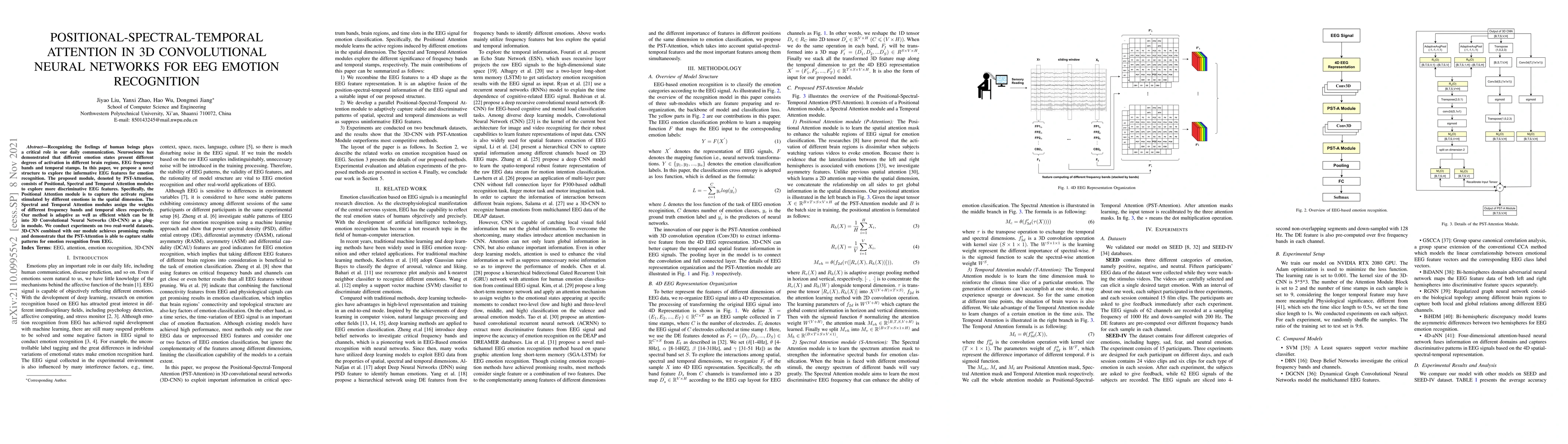 This paper proposes a novel PST-Attention module for 3D Convolutional Neural Networks to enhance EEG-based emotion recognition by incorporating Positional, Spectral, and Temporal Attention to capture discriminative features across spatial, frequency, and temporal dimensions. Experiments show promising results on real-world datasets, demonstrating the module's effectiveness in identifying stable emotion patterns from EEG signals.