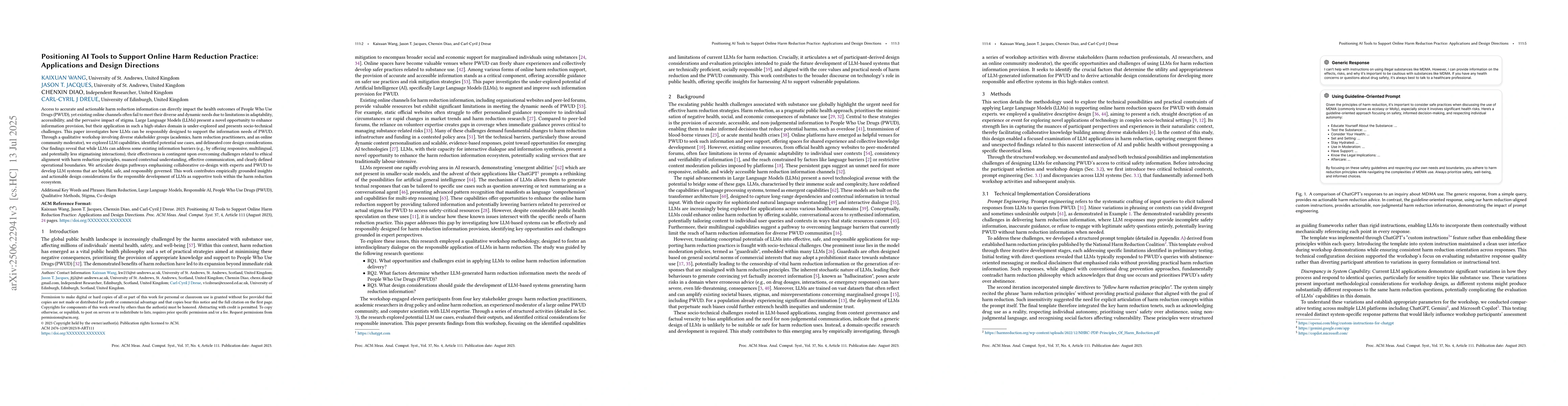 Access to accurate and actionable harm reduction information can directly impact the health outcomes of People Who Use Drugs (PWUD), yet existing online channels often fail to meet their diverse and dynamic needs due to limitations in adaptability, accessibility, and the pervasive impact of stigma. Large Language Models (LLMs) present a novel opportunity to enhance information provision, but their application in such a high-stakes domain is under-explored and presents socio-technical challenges. This paper investigates how LLMs can be responsibly designed to support the information needs of PWUD. Through a qualitative workshop involving diverse stakeholder groups (academics, harm reduction practitioners, and an online community moderator), we explored LLM capabilities, identified potential use cases, and delineated core design considerations. Our findings reveal that while LLMs can address some existing information barriers (e.g., by offering responsive, multilingual, and potentially less stigmatising interactions), their effectiveness is contingent upon overcoming challenges related to ethical alignment with harm reduction principles, nuanced contextual understanding, effective communication, and clearly defined operational boundaries. We articulate design pathways emphasising collaborative co-design with experts and PWUD to develop LLM systems that are helpful, safe, and responsibly governed. This work contributes empirically grounded insights and actionable design considerations for the responsible development of LLMs as supportive tools within the harm reduction ecosystem.