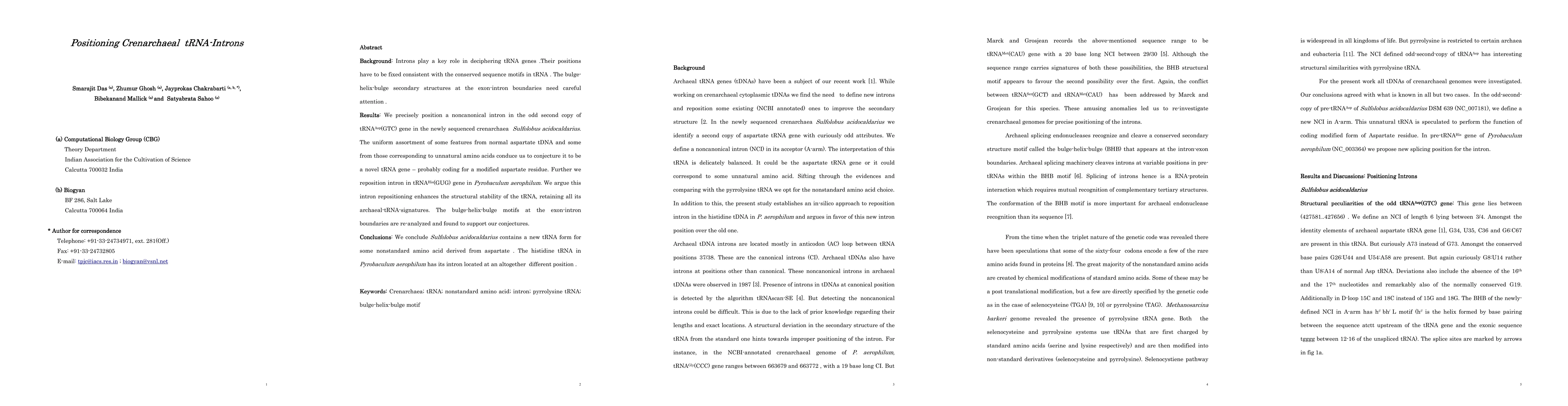 We precisely position a noncanonical intron in the odd second copy of tRNAAsp(GTC) gene in the newly sequenced crenarchaea S.acidocaldarius. The uniform assortment of some features from normal aspartate tDNA and some from those corresponding to non-standard amino acids conduce us to conjecture it to be a novel tRNA gene, probably coding for a modified aspartate residue. Further we reposition intron in tRNAHis(GUG) gene in P.aerophilum.The BHB motif at the exon-intron boundaries are re-analyzed and found to support our conjectures.