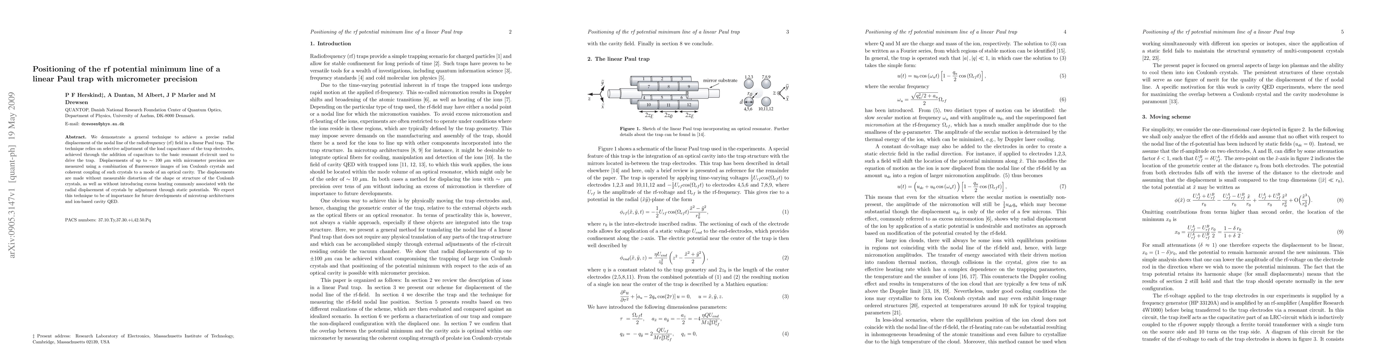 This paper presents a method for precise radial displacement of the rf potential minimum line in a linear Paul trap by adjusting the load capacitance, achieving up to 100 micrometer displacements with micrometer precision. The technique avoids distortion and excess heating, making it valuable for future microtrap architectures and ion-based cavity quantum electrodynamics.
