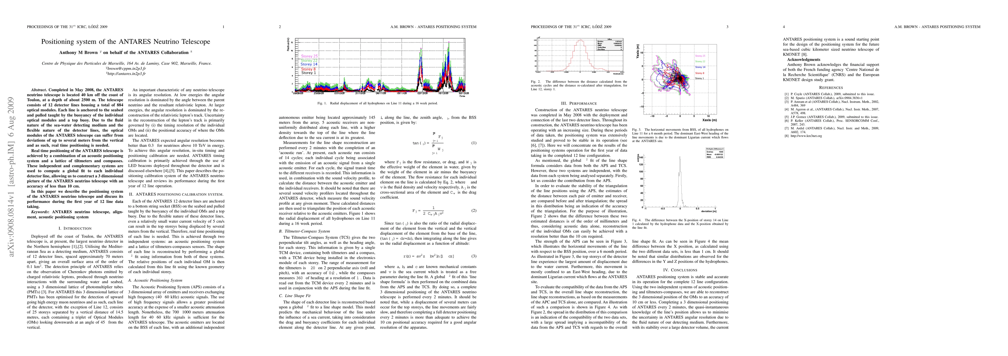 The ANTARES neutrino telescope employs a combination of acoustic positioning and tiltmeters/compasses to achieve real-time positioning accuracy of less than 10 cm, addressing deviations in its flexible detector lines due to sea-water conditions. The system's performance was evaluated during the first year of data collection.