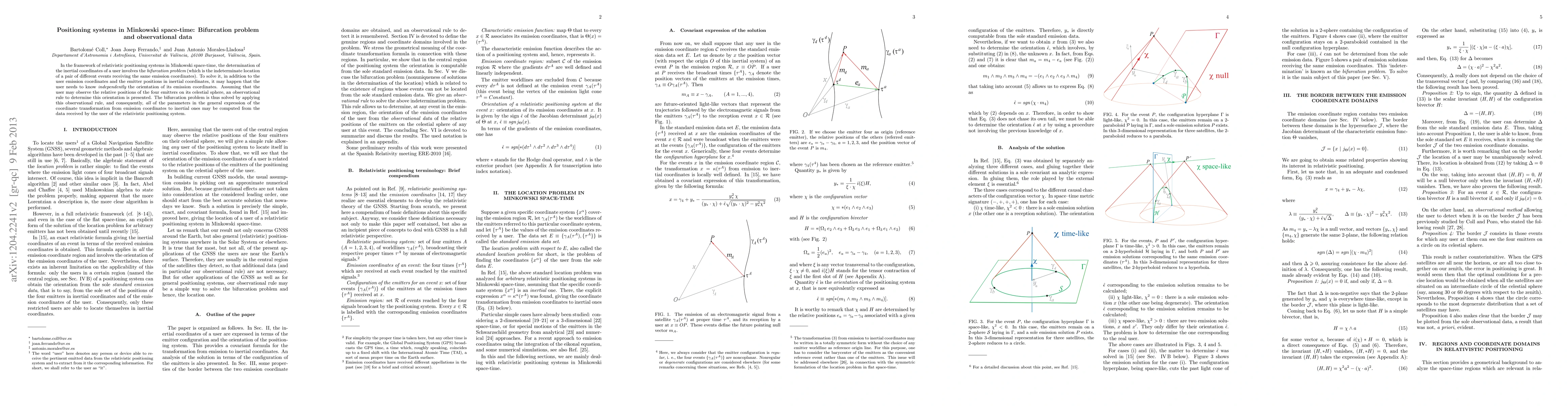 In the framework of relativistic positioning systems in Minkowski space-time, the determination of the inertial coordinates of a user involves the {\em bifurcation problem} (which is the indeterminate location of a pair of different events receiving the same emission coordinates). To solve it, in addition to the user emission coordinates and the emitter positions in inertial coordinates, it may happen that the user needs to know {\em independently} the orientation of its emission coordinates. Assuming that the user may observe the relative positions of the four emitters on its celestial sphere, an observational rule to determine this orientation is presented. The bifurcation problem is thus solved by applying this observational rule, and consequently, {\em all} of the parameters in the general expression of the coordinate transformation from emission coordinates to inertial ones may be computed from the data received by the user of the relativistic positioning system.
