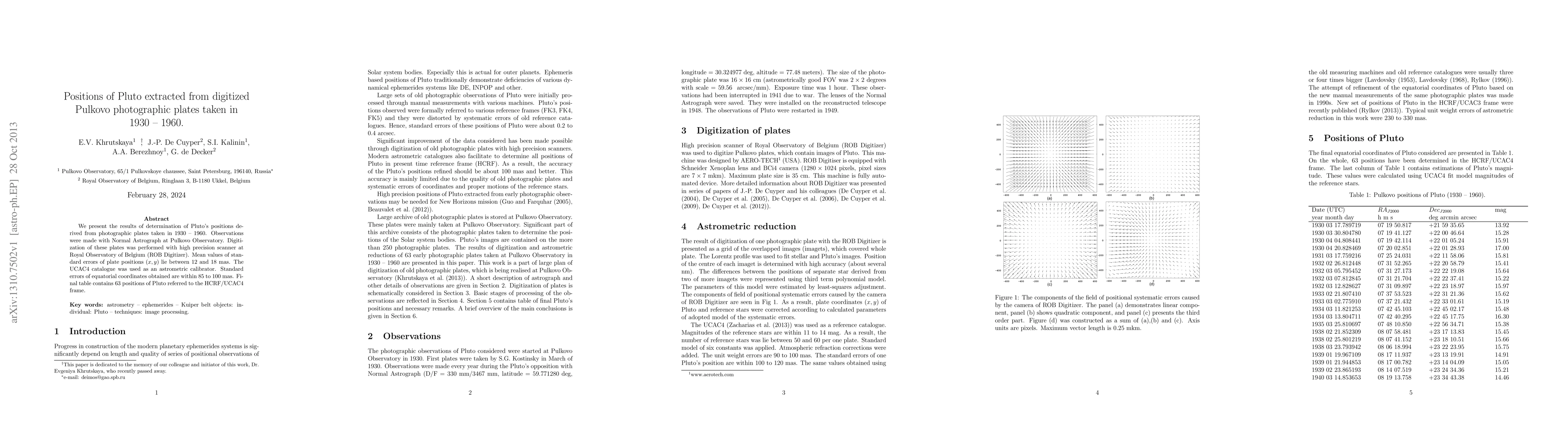 We present the results of determination of Pluto's positions derived from photographic plates taken in 1930 - 1960. Observations were made with Normal Astrograph at Pulkovo Observatory. Digitization of these plates was performed with high precision scanner at Royal Observatory of Belgium (ROB Digitizer). Mean values of standard errors of plate positions (x,y) lie between 12 and 18 mas. The UCAC4 catalogue was used as an astrometric calibrator. Standard errors of equatorial coordinates obtained are within 85 to 100 mas. Final table contains 63 positions of Pluto referred to the HCRF/UCAC4 frame.