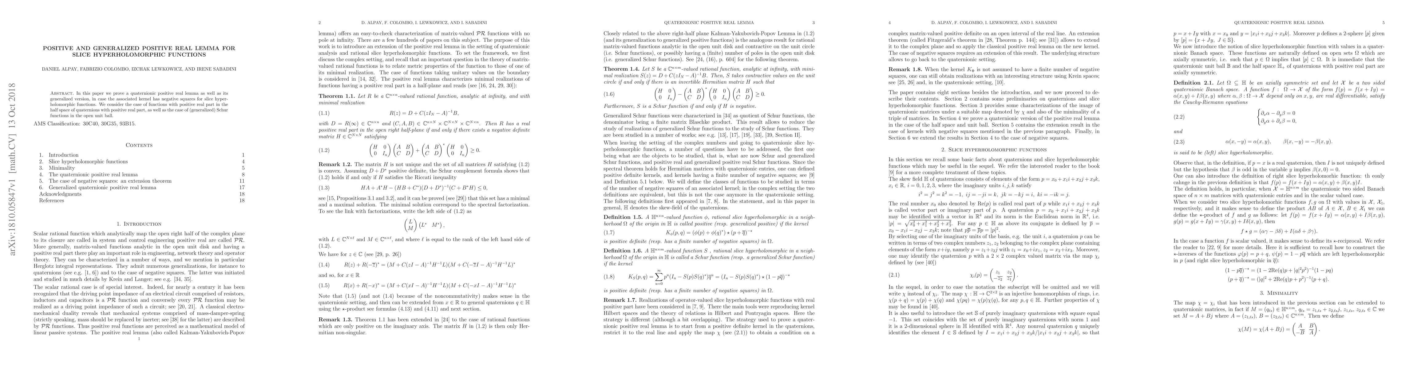 This paper proves a quaternionic positive real lemma and its generalized version for slice hyperholomorphic functions, focusing on functions with positive real parts in specific quaternionic spaces, including the half space and the open unit ball.