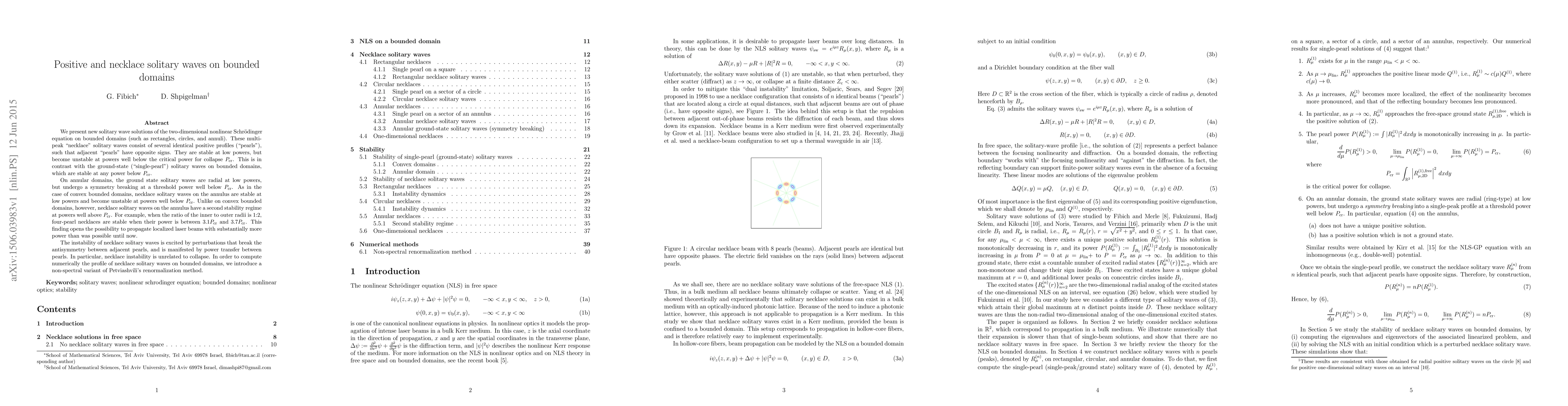 We present new solitarywave solutions of the two-dimensional nonlinear Schrodinger equation on bounded domains (such as rectangles, circles, and annuli). These multipeak necklace solitary waves consist of several identical positive profiles (pearls), such that adjacent pearls have opposite signs. They are stable at low powers, but become unstable at powers well below the critical power for collapse Pcr. This is in contrast with the ground-state (single-pearl) solitary waves on bounded domains, which are stable at any power below Pcr. On annular domains, the ground state solitary waves are radial at low powers, but undergo a symmetry breaking at a threshold power well below Pcr. As in the case of convex bounded domains, necklace solitary waves on the annulus are stable at low powers and become unstable at powers well below Pcr. Unlike on convex bounded domains, however, necklace solitarywaves on the annulus have a second stability regime at powers well above Pcr. For example, when the ratio of the inner to outer radii is 1:2, four-pearl necklaces are stable when their power is between 3.1Pcr and 3.7Pcr. This finding opens the possibility to propagate localized laser beams with substantiallymore power than was possible until now. The instability of necklace solitary waves is excited by perturbations that break the antisymmetry between adjacent pearls, and is manifested by power transfer between pearls. In particular, necklace instability is unrelated to collapse. In order to compute numerically the profile of necklace solitary waves on bounded domains, we introduce a non-spectral variant of Petviashvilis renormalization method.