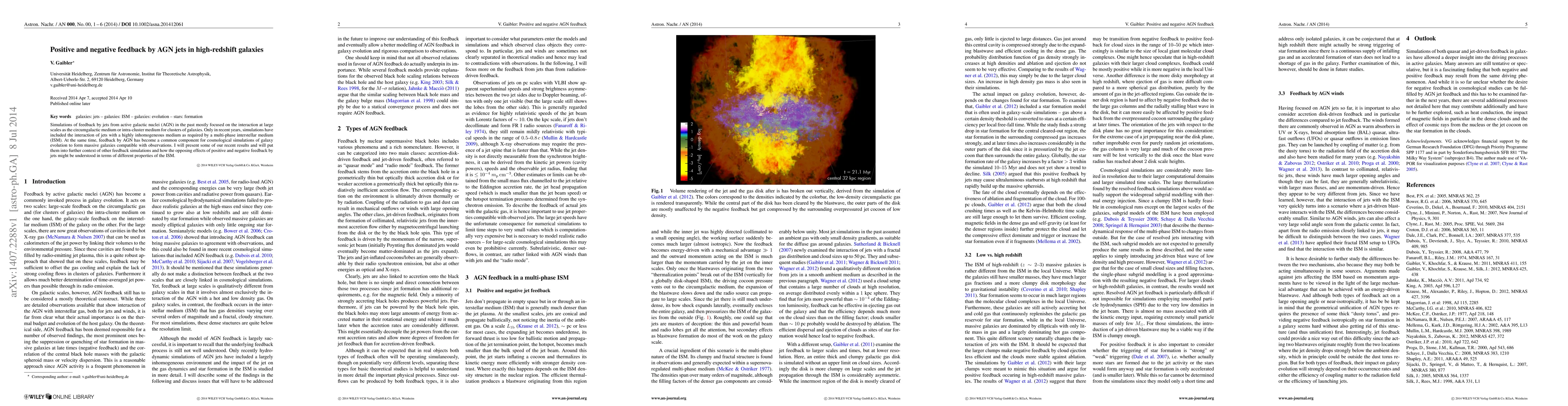 The paper discusses recent simulations of AGN jet feedback in high-redshift galaxies, focusing on interactions with inhomogeneous interstellar medium (ISM). It compares different feedback models and explores the opposing effects of positive and negative feedback by jets.