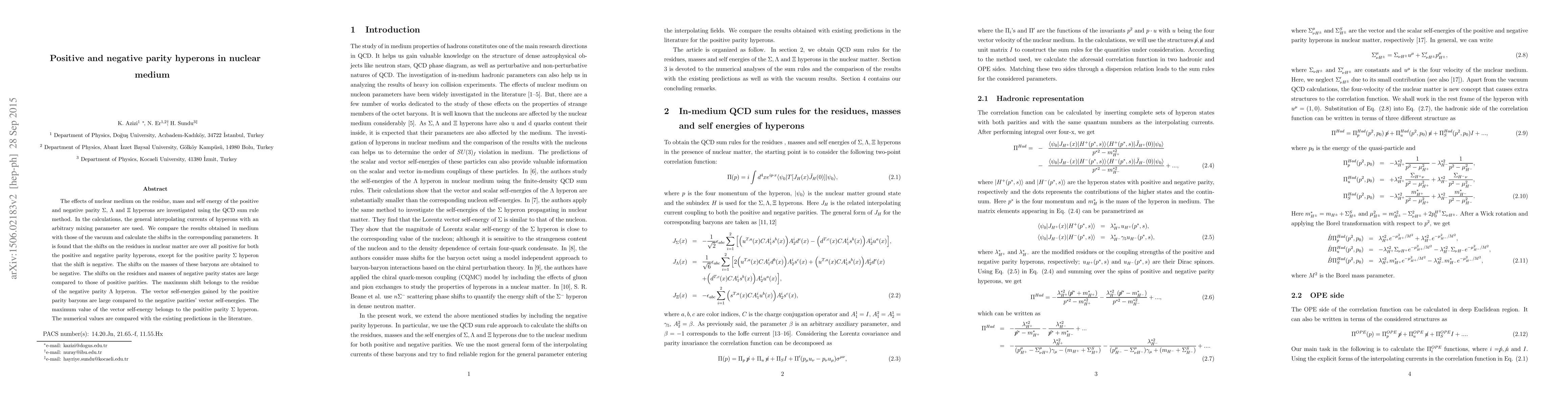 This study investigates the effects of nuclear medium on the residue, mass, and self-energy of positive and negative parity hyperons ($\Sigma$, $\Lambda$, $\Xi$) using the QCD sum rule method. Results show positive shifts in residues for most hyperons, with negative shifts for the positive parity $\Sigma$ hyperon, and negative shifts in masses. Negative parity hyperons exhibit larger shifts compared to positive parity ones, with the largest residue shift in the negative parity $\Lambda$ hyperon and the highest vector self-energy in the positive parity $\Sigma$ hyperon.