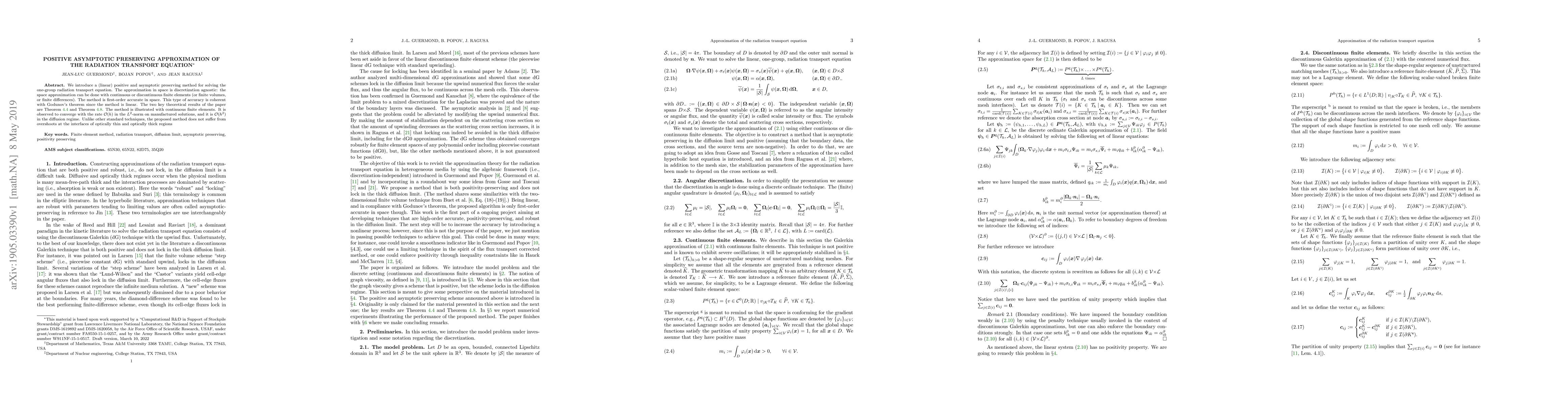 We introduce a (linear) positive and asymptotic preserving method or solving the one-group radiation transport equation. The approximation in space is discretization agnostic: the space approximation can be done with continuous or discontinuous finite elements (or finite volumes, or finite differences). The method is first-order accurate in space. This type of accuracy is coherent with Godunov's theorem since the method is linear. The two key theoretical results of the paper are Theorem~4.4 and Theorem~4.8. The method is illustrated with continuous finite elements. It is observed to converge with the rate $\calO(h)$ in the $L^2$-norm on manufactured solutions, and it is $\calO(h^2)$ in the diffusion regime. Unlike other standard techniques, the proposed method does not suffer from overshoots at the interfaces of optically thin and optically thick regions.