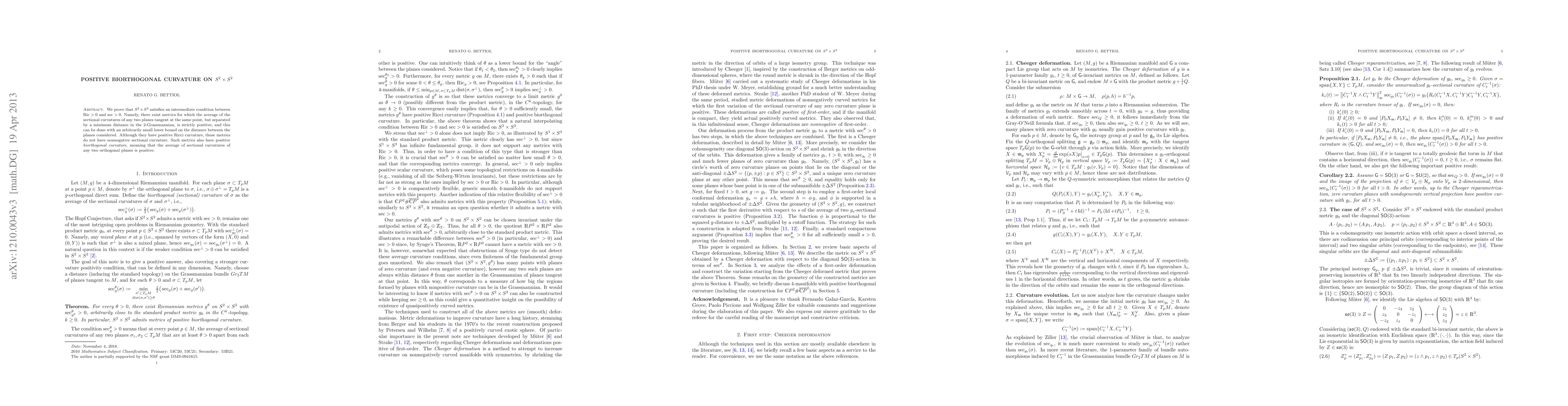 Researchers prove that S^2 x S^2 can have metrics with positive biorthogonal curvature, without nonnegative sectional curvature or positive Ricci curvature, offering a new condition between these concepts.