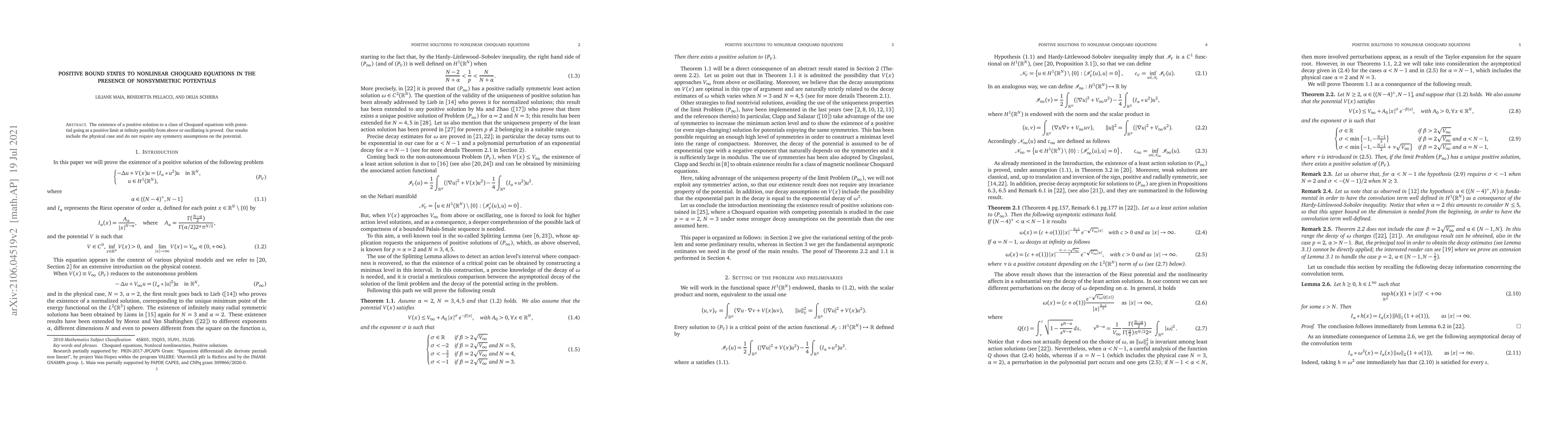 The existence of a positive solution to a class of Choquard equations with potential going at a positive limit at infinity possibly from above or oscillating is proved. Our results include the physical case and do not require any symmetry assumptions on the potential.