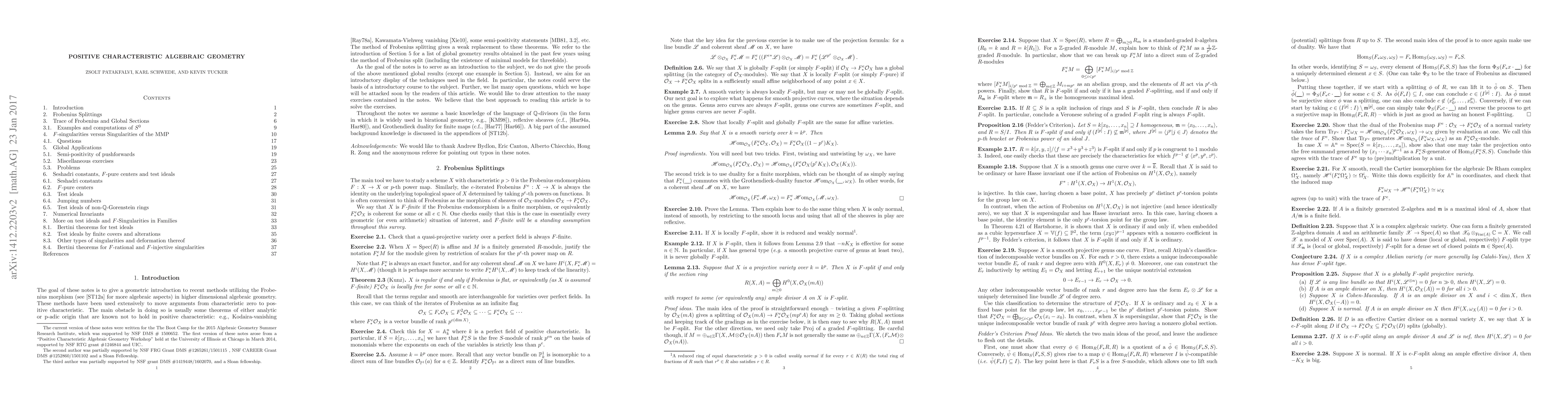 Summary: This paper provides notes from a workshop on positive characteristic algebraic geometry, focusing on topics discussed during the 2015 AMS Summer Institute and earlier sessions at the University of Illinois at Chicago. It aims to elucidate advanced concepts in algebraic geometry within positive characteristic settings.