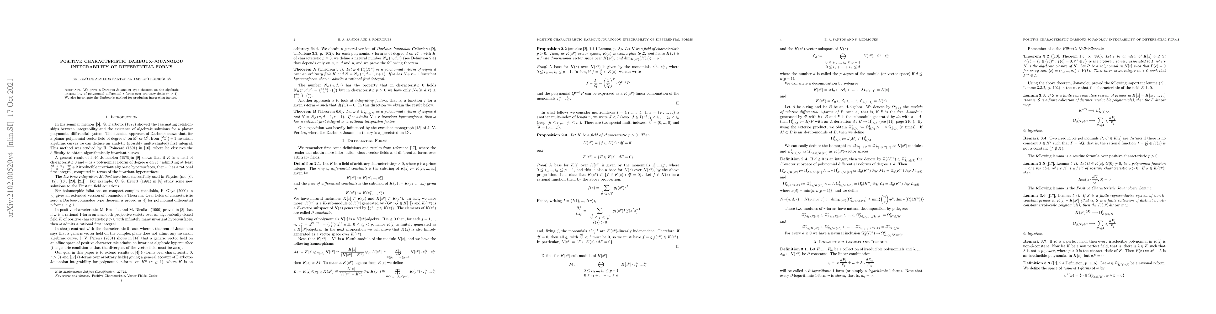 Summary: The paper proves a Darboux-Jouanolou theorem for the algebraic integrability of polynomial differential forms over arbitrary fields and explores Darboux's method for generating integrating factors.