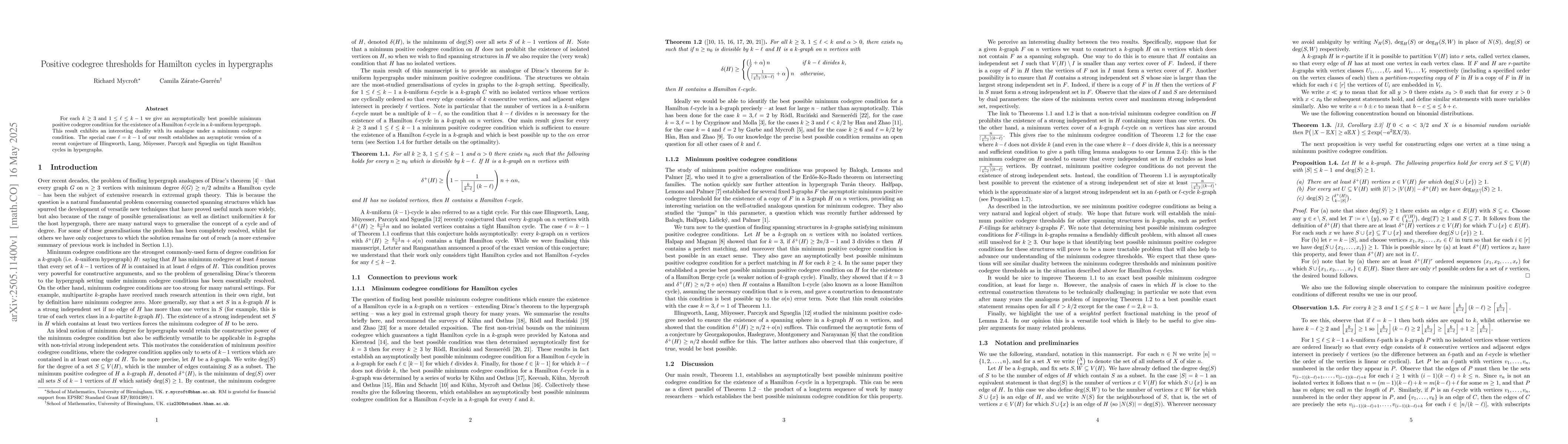 This research paper establishes minimum positive codegree conditions for Hamilton cycles in hypergraphs, providing an asymptotically best possible threshold for the existence of a Hamilton cycle, and exhibiting a duality with its analogue under a minimum codegree condition.
