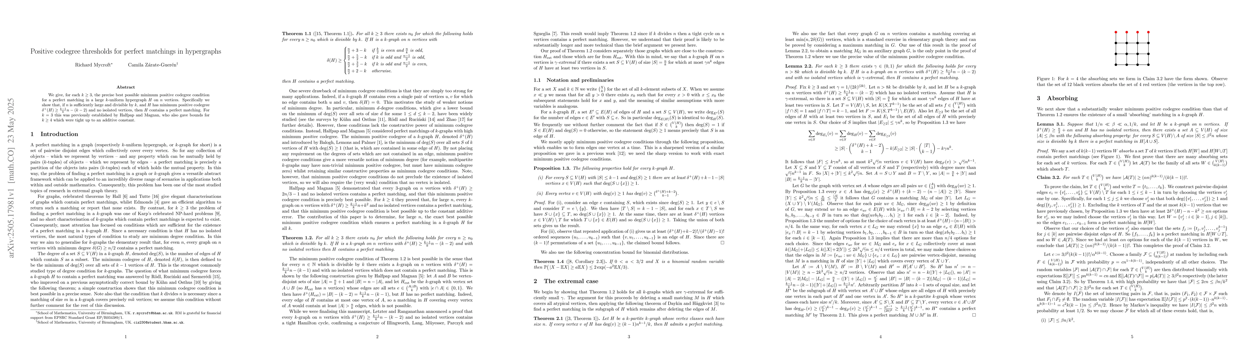 A research paper establishes precise minimum positive codegree conditions for perfect matchings in large k-uniform hypergraphs, showing that a sufficient positive codegree threshold guarantees the existence of a perfect matching.