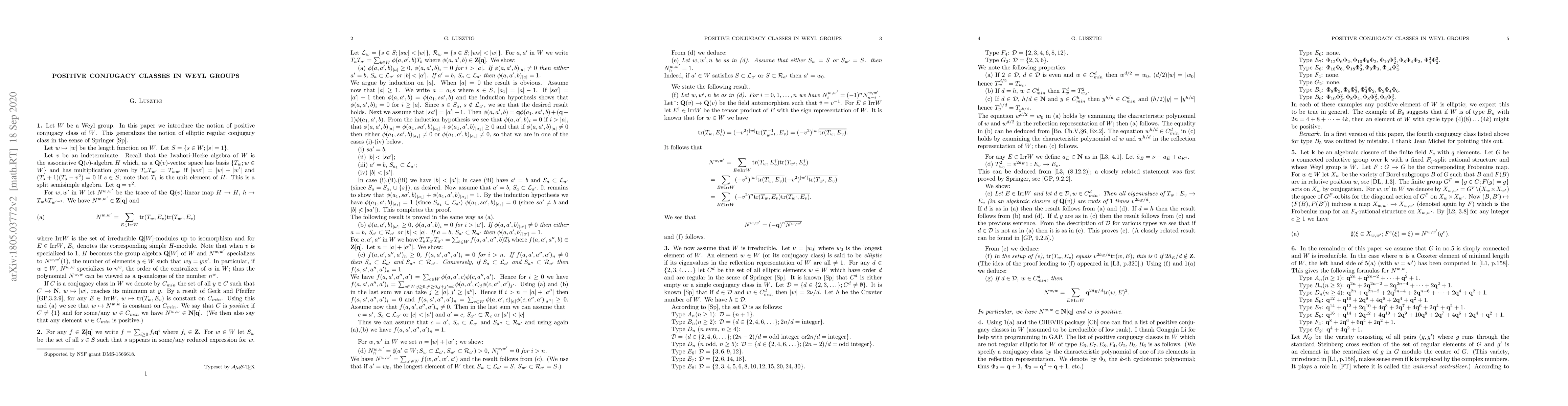 Summary: This paper introduces the concept of positive conjugacy classes in Weyl groups, extending the idea of regular elliptic conjugacy classes from Springer's theory, thereby providing a new framework for understanding conjugacy within these algebraic structures.