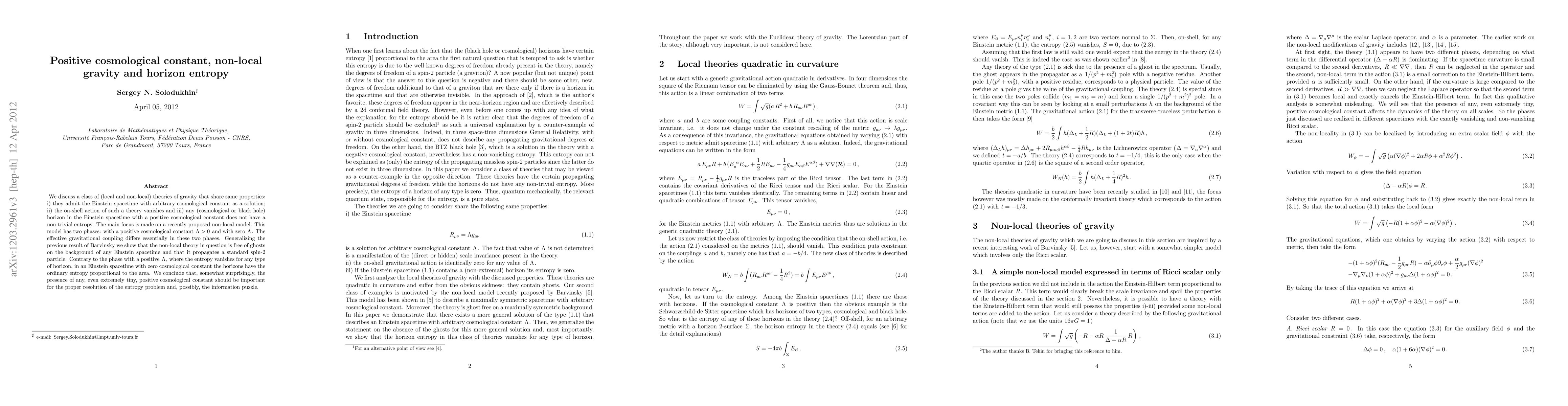 This paper explores non-local gravity theories that allow for a positive cosmological constant, demonstrating they lack horizon entropy in such contexts. It highlights a non-local model transitioning between phases with $\Lambda > 0$ and $\Lambda = 0$, showing the latter permits ordinary horizon entropy proportional to area, suggesting the positive cosmological constant's presence is crucial for resolving entropy and information puzzles.