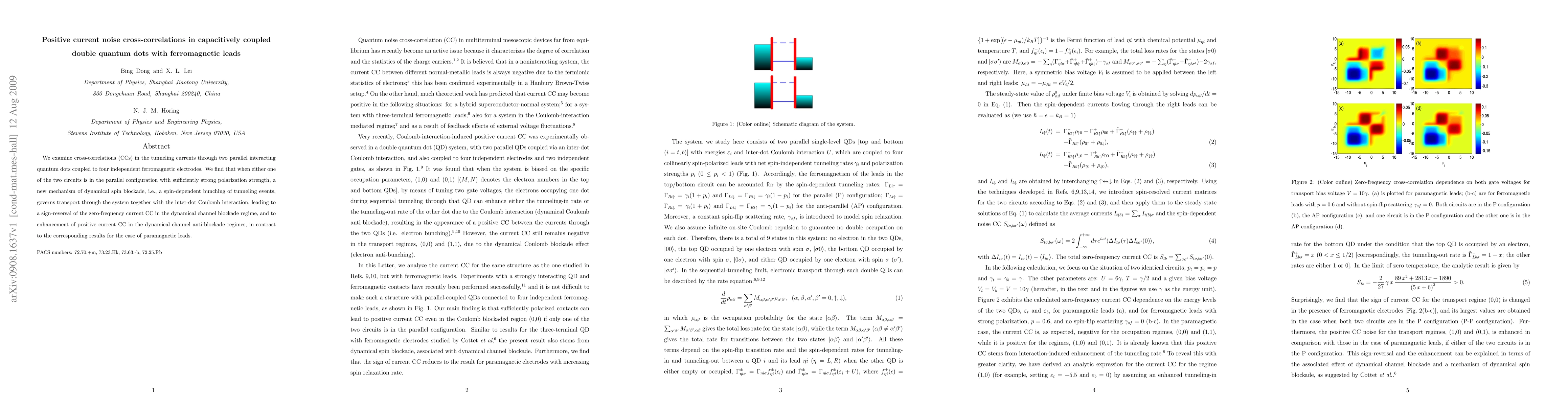 This paper investigates the cross-correlations in tunneling currents through two capacitively coupled quantum dots with ferromagnetic leads, revealing a spin-dependent dynamical spin blockade mechanism that reverses the zero-frequency current CC and enhances positive current CC under certain conditions, differing from systems with paramagnetic leads.