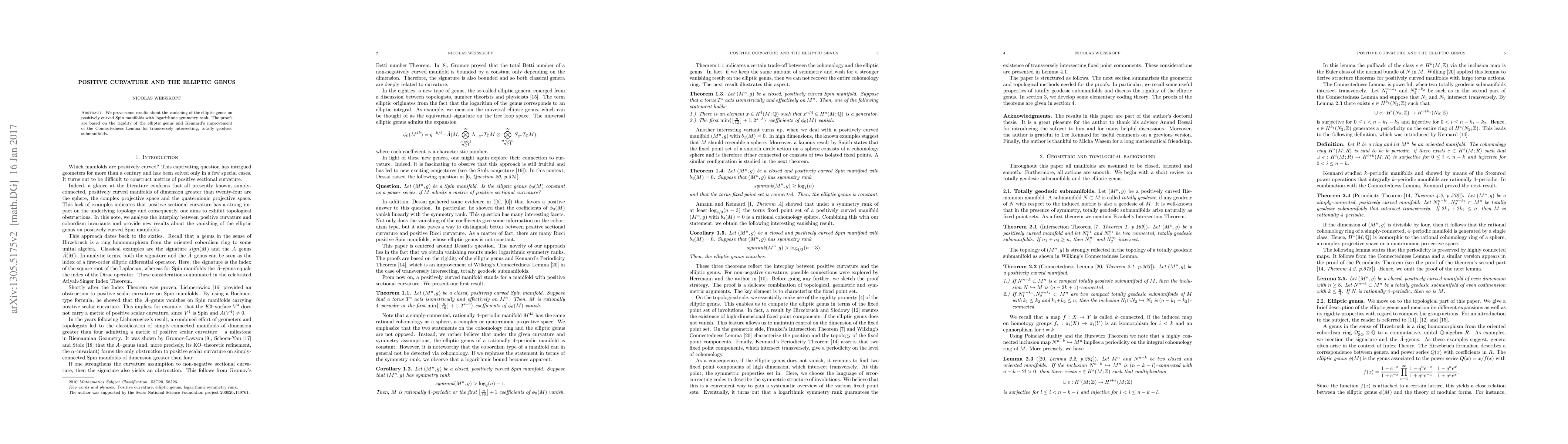 We prove several results about the vanishing of the elliptic genus on positively curved Spin manifolds with logarithmic symmetry rank. The proofs are based on the rigidity of the elliptic genus and Kennard's improvement of the Connectedness Lemma for transversely intersecting, totally geodesic submanifolds.