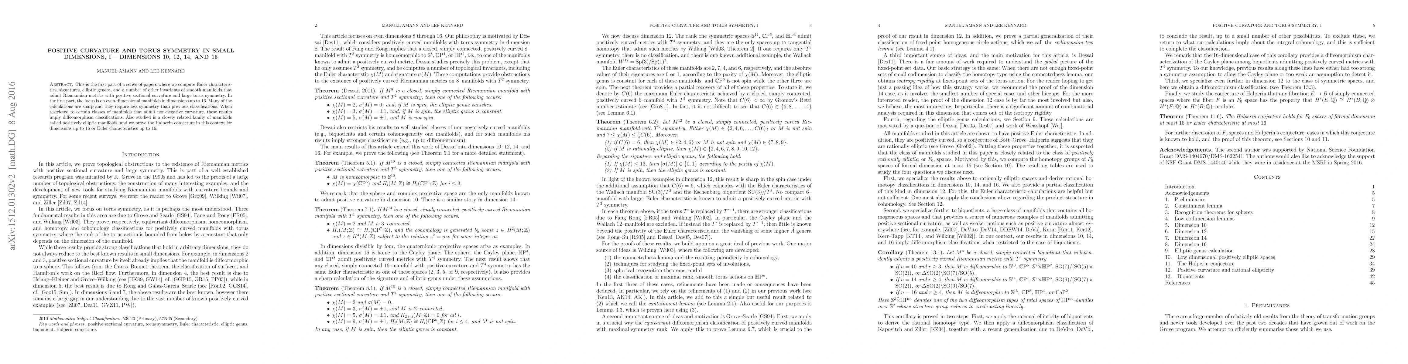 This is the first part of a series of papers where we compute Euler characteristics, signatures, elliptic genera, and a number of other invariants of smooth manifolds that admit Riemannian metrics with positive sectional curvature and large torus symmetry. In the first part, the focus is on even-dimensional manifolds in dimensions up to 16. Many of the calculations are sharp and they require less symmetry than previous classifications. When restricted to certain classes of manifolds that admit non-negative curvature, these results imply diffeomorphism classifications. Also studied is a closely related family of manifolds called positively elliptic manifolds, and we prove the Halperin conjecture in this context for dimensions up to 16 or Euler characteristics up to 16.