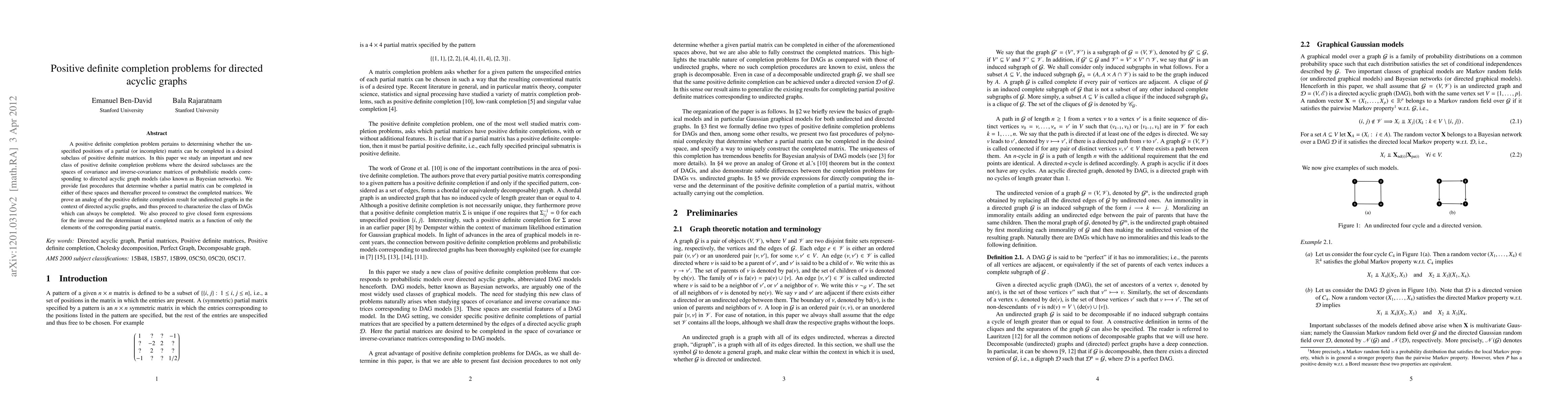 This paper investigates positive definite completion problems for directed acyclic graphs (DAGs), focusing on completing partial matrices into covariance or inverse-covariance matrices of probabilistic models. It provides efficient procedures for determining and constructing such completions, and characterizes DAGs that can always be completed.