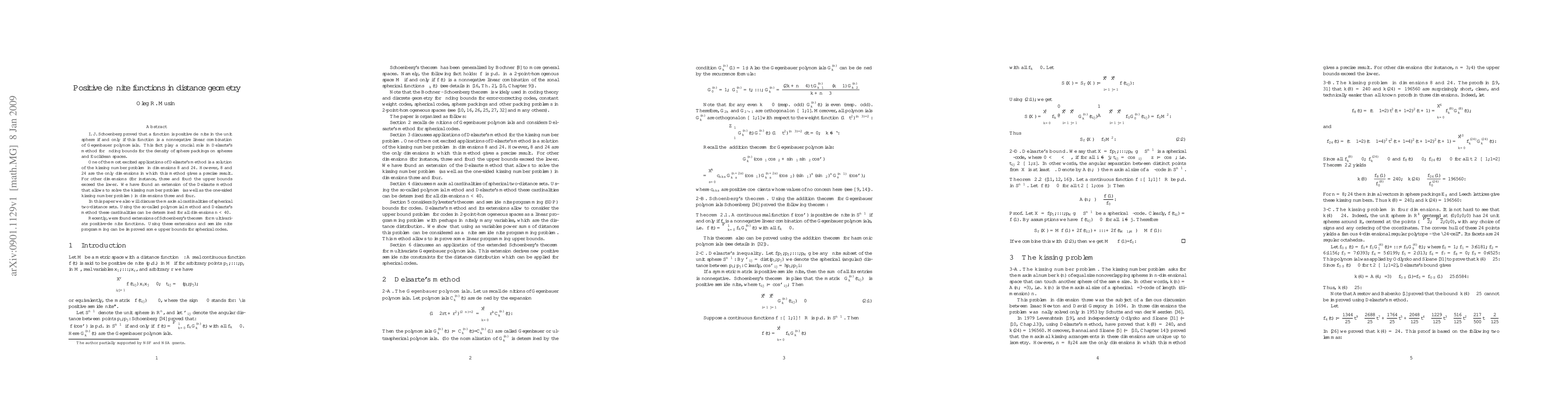 I. J. Schoenberg proved that a function is positive definite in the unit sphere if and only if this function is a nonnegative linear combination of Gegenbauer polynomials. This fact play a crucial role in Delsarte's method for finding bounds for the density of sphere packings on spheres and Euclidean spaces. One of the most excited applications of Delsarte's method is a solution of the kissing number problem in dimensions 8 and 24. However, 8 and 24 are the only dimensions in which this method gives a precise result. For other dimensions (for instance, three and four) the upper bounds exceed the lower. We have found an extension of the Delsarte method that allows to solve the kissing number problem (as well as the one-sided kissing number problem) in dimensions three and four. In this paper we also will discuss the maximal cardinalities of spherical two-distance sets. Using the so-called polynomial method and Delsarte's method these cardinalities can be determined for all dimensions $n<40$. Recently, were found extensions of Schoenberg's theorem for multivariate positive-definite functions. Using these extensions and semidefinite programming can be improved some upper bounds for spherical codes.