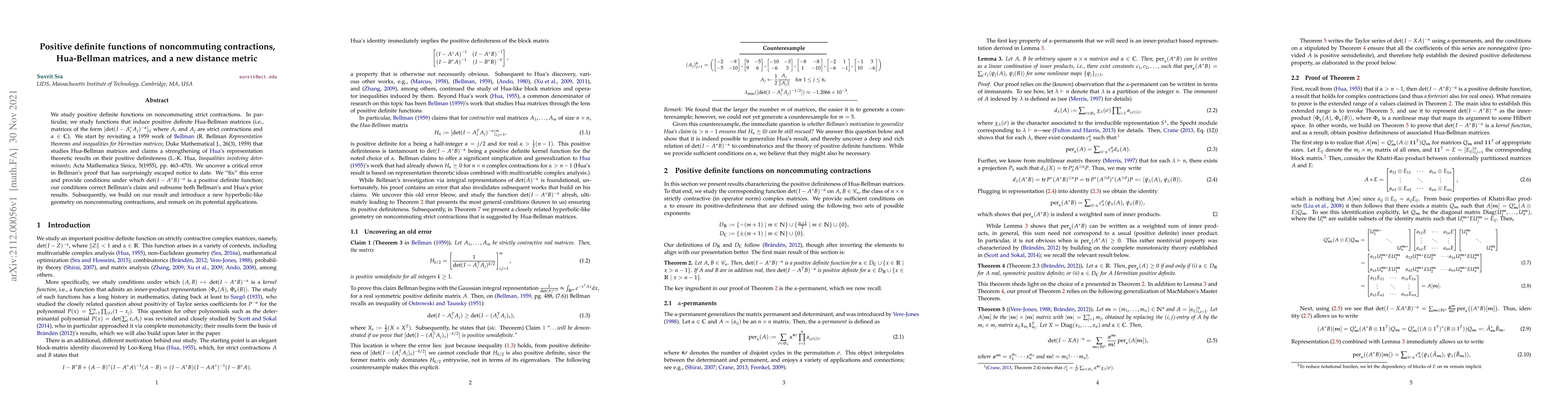 We study positive definite functions on noncommuting strict contractions. In particular, we study functions that induce positive definite Hua-Bellman matrices (i.e., matrices of the form $[\det(I-A_i^*A_j)^{-\alpha}]_{ij}$ where $A_i$ and $A_j$ are strict contractions and $\alpha\in\mathbb{C}$). We start by revisiting a 1959 work of \citeauthor{bellman1959} (R.~Bellman~\emph{Representation theorems and inequalities for Hermitian matrices}; Duke Mathematical J., 26(3), 1959) that studies Hua-Bellman matrices and claims a strengthening of \citeauthor{hua1955}'s representation theoretic results on their positive definiteness~(L.-K. Hua, \emph{Inequalities involving determinants}; Acta Mathematica Sinica, 5(1955), pp.~463--470). We uncover a critical error in Bellman's proof that has surprisingly escaped notice to date. We "fix" this error and provide conditions under which $\det(I-A^*B)^{-\alpha}$ is a positive definite function; our conditions correct Bellman's claim and subsume both Bellman's and Hua's prior results. Subsequently, we build on our result and introduce a new hyperbolic-like geometry on noncommuting contractions, and remark on its potential applications.