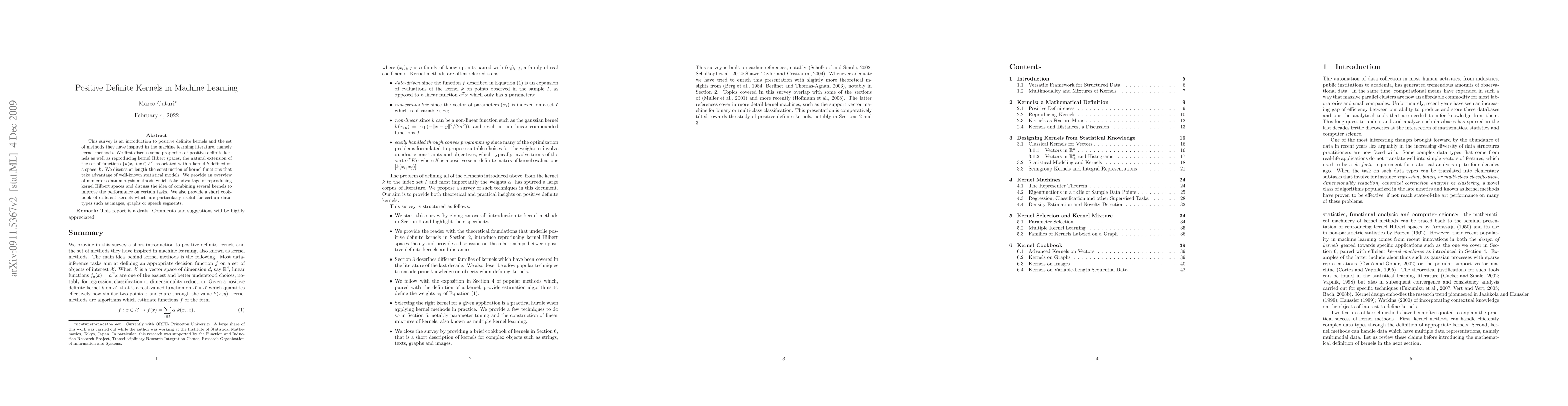This paper surveys positive definite kernels and their application in kernel methods within machine learning, focusing on their properties, construction, and use in data-analysis techniques. It also highlights combining kernels for enhanced performance and provides useful kernels for specific data types.