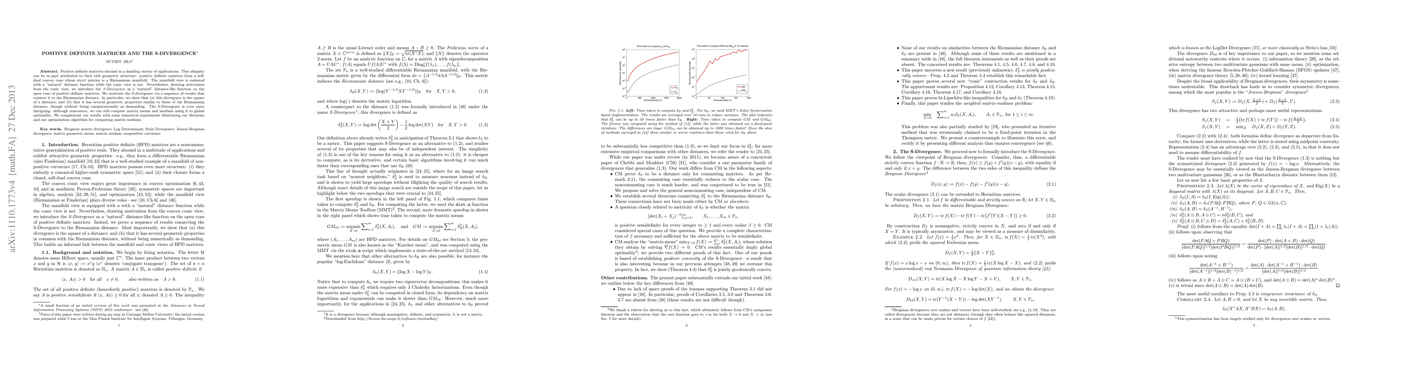 This paper introduces the S-divergence, a novel distance-like function for positive definite matrices, motivated by their geometric properties. It demonstrates that the S-divergence shares geometric properties with the Riemannian distance while being computationally more efficient, and it enables optimal computation of matrix means and medians.