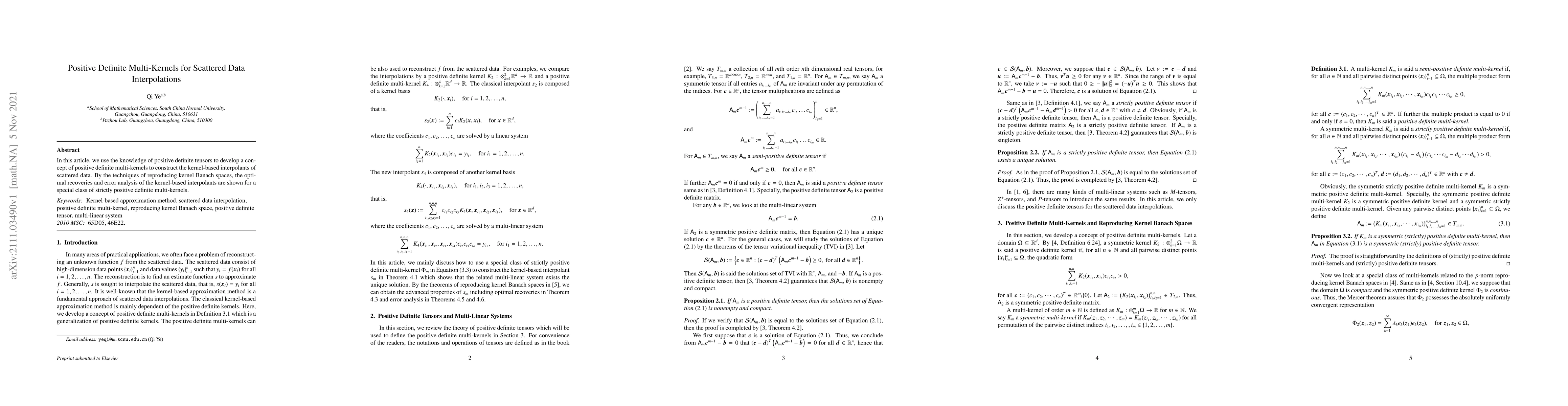 The paper introduces positive definite multi-kernels and demonstrates their use in scattered data interpolation, linking them to reproducing kernel Banach spaces for error analysis and optimal recovery.